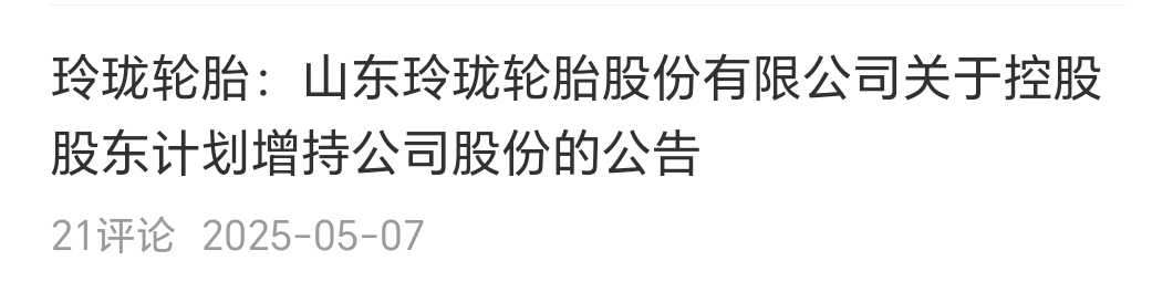 我不知道其他投资者看到这个情况会做何反应,我只知道实控人王锋一家坐不住了,2025年5月7日,玲珑轮胎发布公告:基于对公司未来发展的信心和价值的认可,以及为维护股价稳定和股东利益,控股股东玲珑集团拟在未来6个月以内,以集中竞价的方式增持公司股份两到3亿元。
