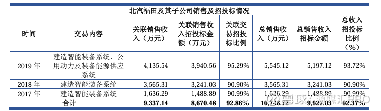 招股书显示,2017年至2019年,迈赫股份主要为北汽福田及其子公司销售智能装备系统,关联销售金额分别为0.16亿元、0.36亿元和0.41亿元,合计约为0.93亿元,分别占公司同期营收比例为3.04%、5.08%和5.64%。