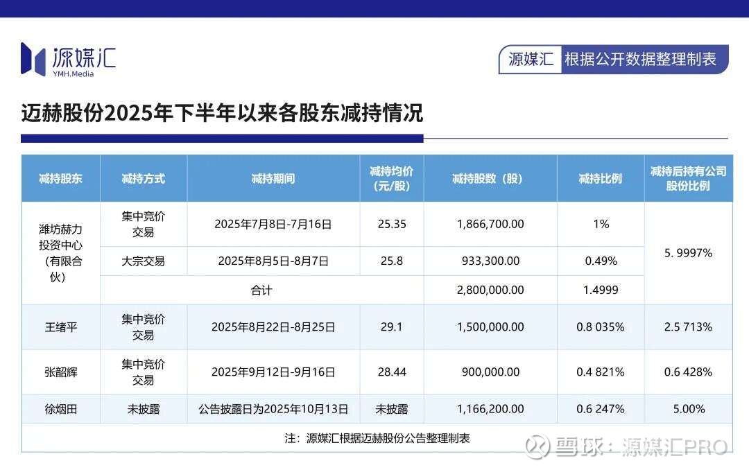 根据迈赫股份公告披露的减持情况,2025年7月初至10月底,赫力投资、王绪平和张韶辉分别减持280万股、150万股和90万股,以各自减持均价计算,套现金额分别约为0.71亿元、0.44亿元、0.26亿元,合计约1.41亿元。期间,徐烟田也被披露已累计减持116.62万股公司股份。