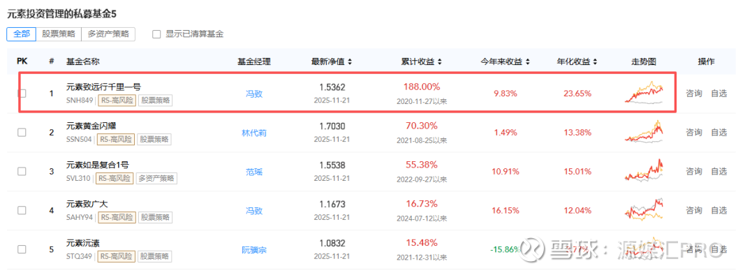 私募排排网信息显示,截至2025年11月,元素基金管理规模约5亿-10亿元,旗下共运行5只基金产品。其中,此次接手常山药业股份的“元素致远行千里一号”成立于2020年,成立5年来累计收益达188%,是基金核心主力产品之一;其余4只产品的累计收益在15%-70%,且这5款产品均属于R5级高风险产品。
