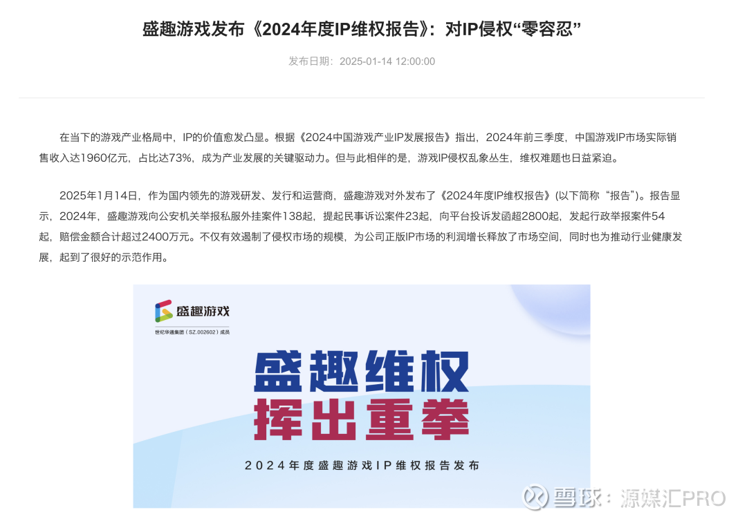 同时,盛趣在2023年重新拿下传奇IP中国大陆的独占授权,等于控制了正版内容供给的入口。综合多方信源,传奇授权费用在几千万到上亿不等,并分享发行流水分成。更有意思的是,盛趣2024年通过IP维权获赔超2400万元,其中传奇IP是大头。
