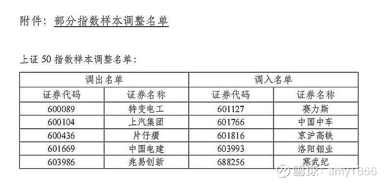 前一阵寒王暴涨的时候,我反正是买不了科创板,所以没有怎么关注。但是突然想起来,寒王去年调入上涨50指数的时候,我好像还截过一张图,我就把那张上证50指数调整名单找出来看了下,图在后面。