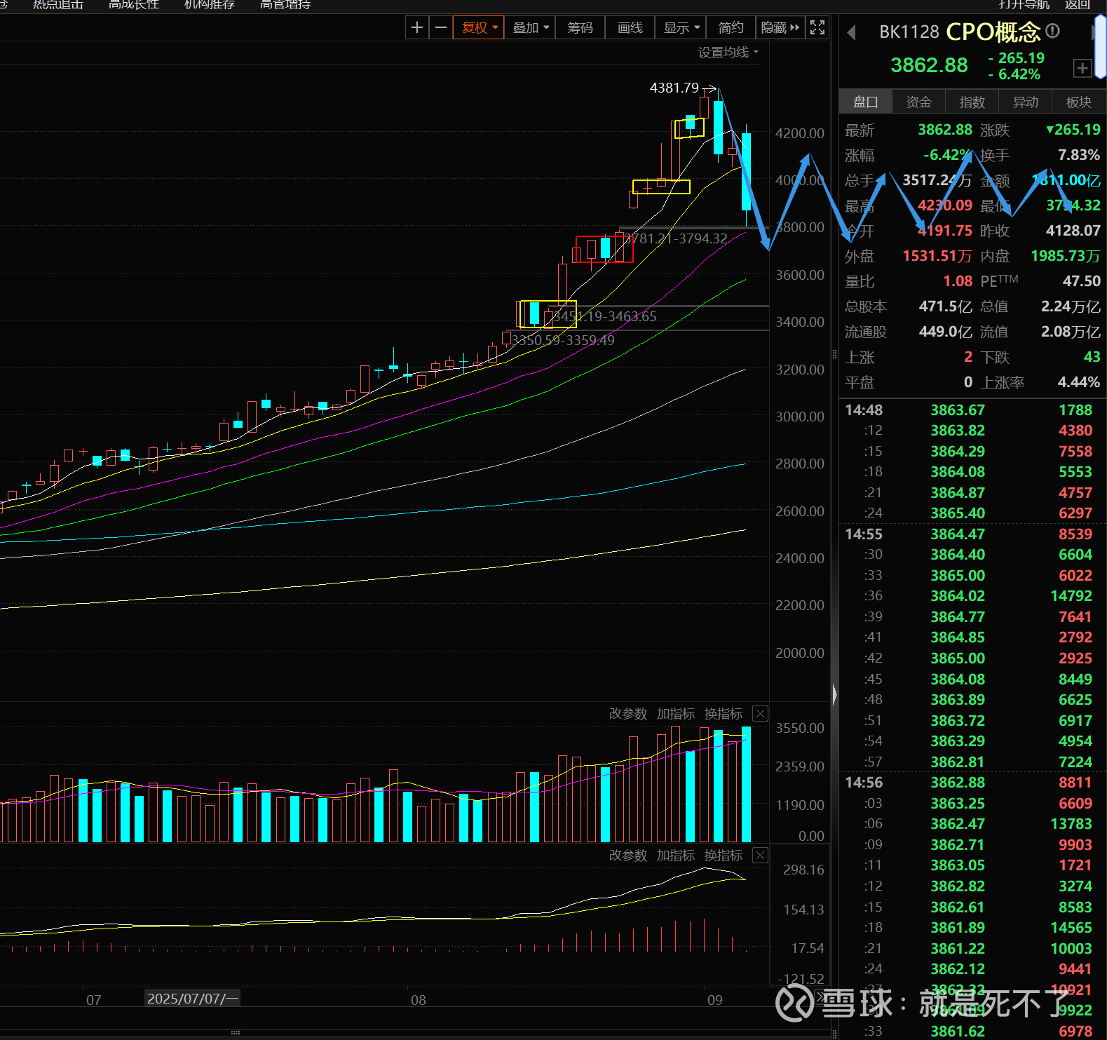 到底什么位置获得支撑,这个我没办法准确预判,大概就在红框的附近,如果融资盘杀的比较狠,会击穿。