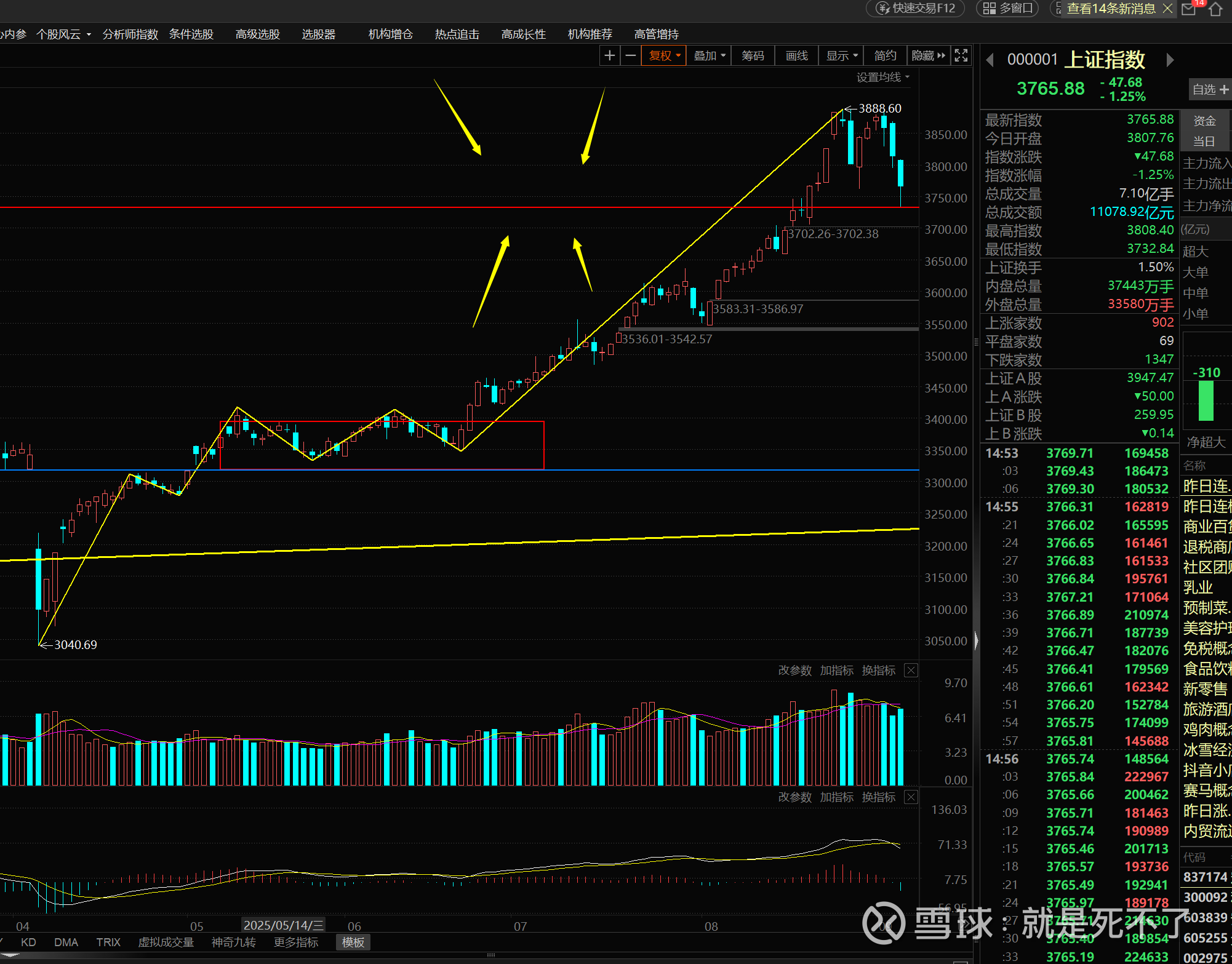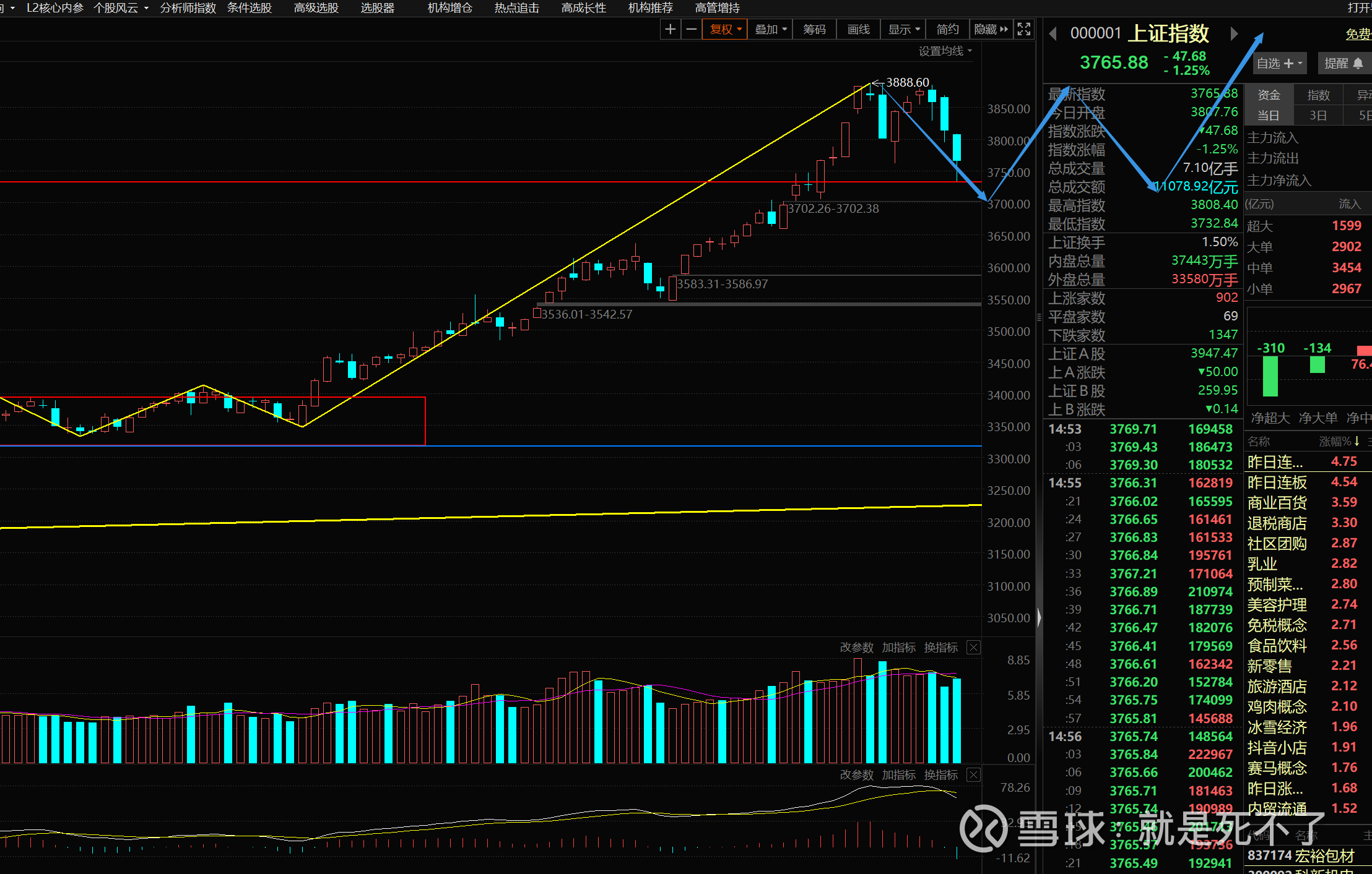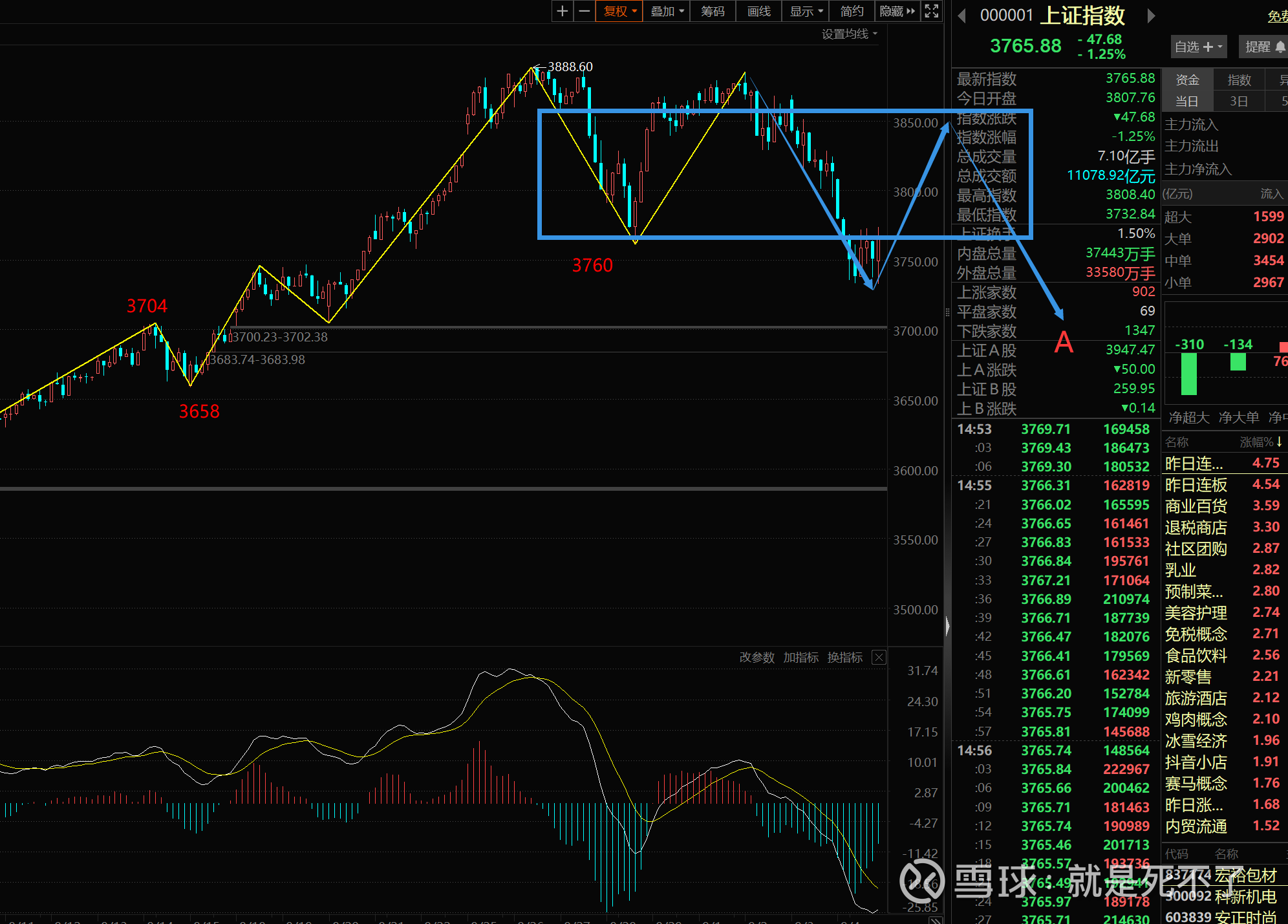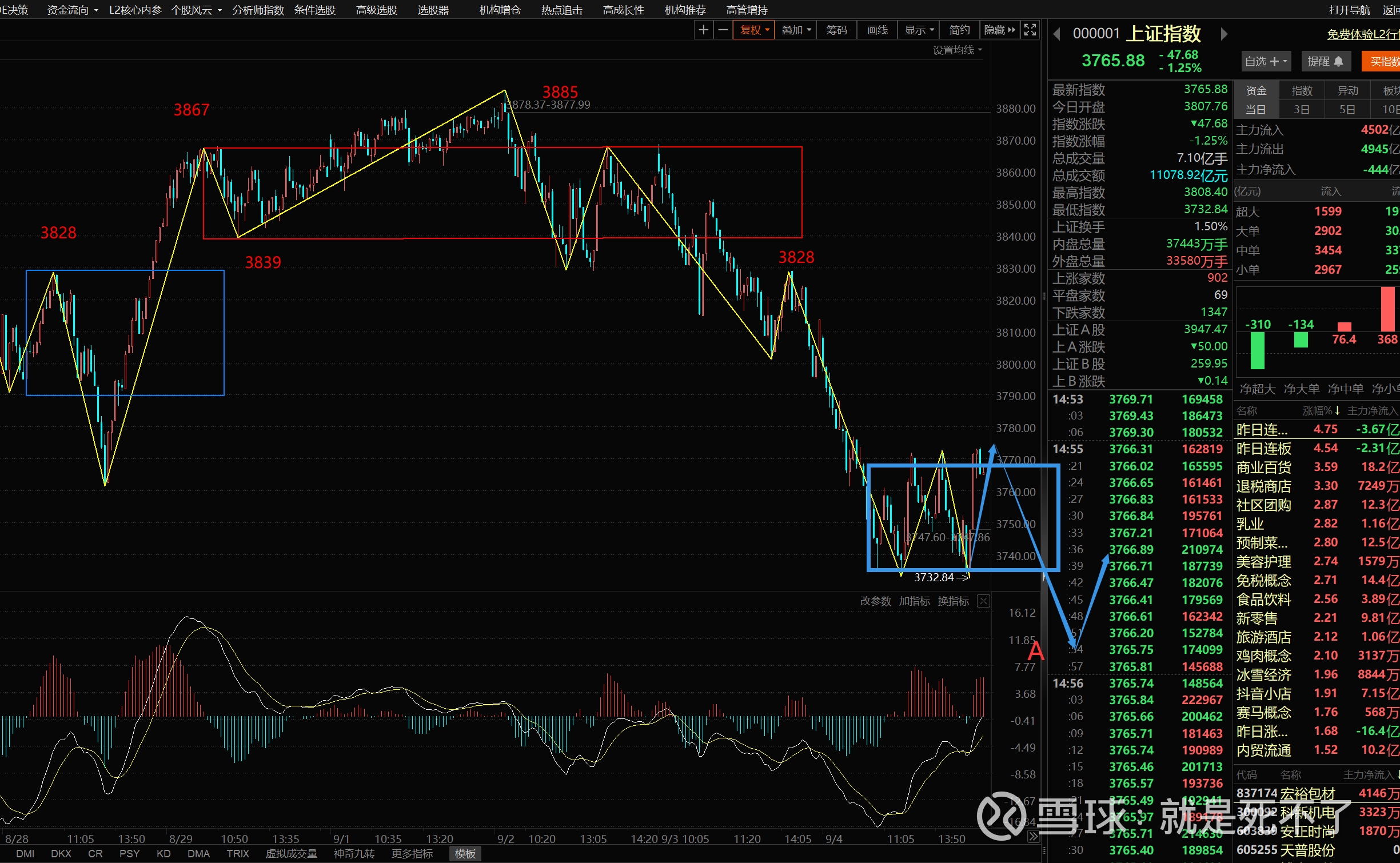 接下来分析指数,下面是上证的日线图,今天跌完,3888就是日线高点,目前要构筑一个日线的中枢,时间大概一个月。