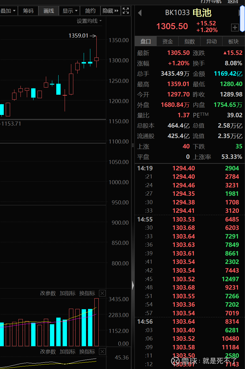 比如这个电池板块,最近是抗跌的,但是走了三根上影线,传统理论有句话叫:头顶三柱香,不死也受伤。