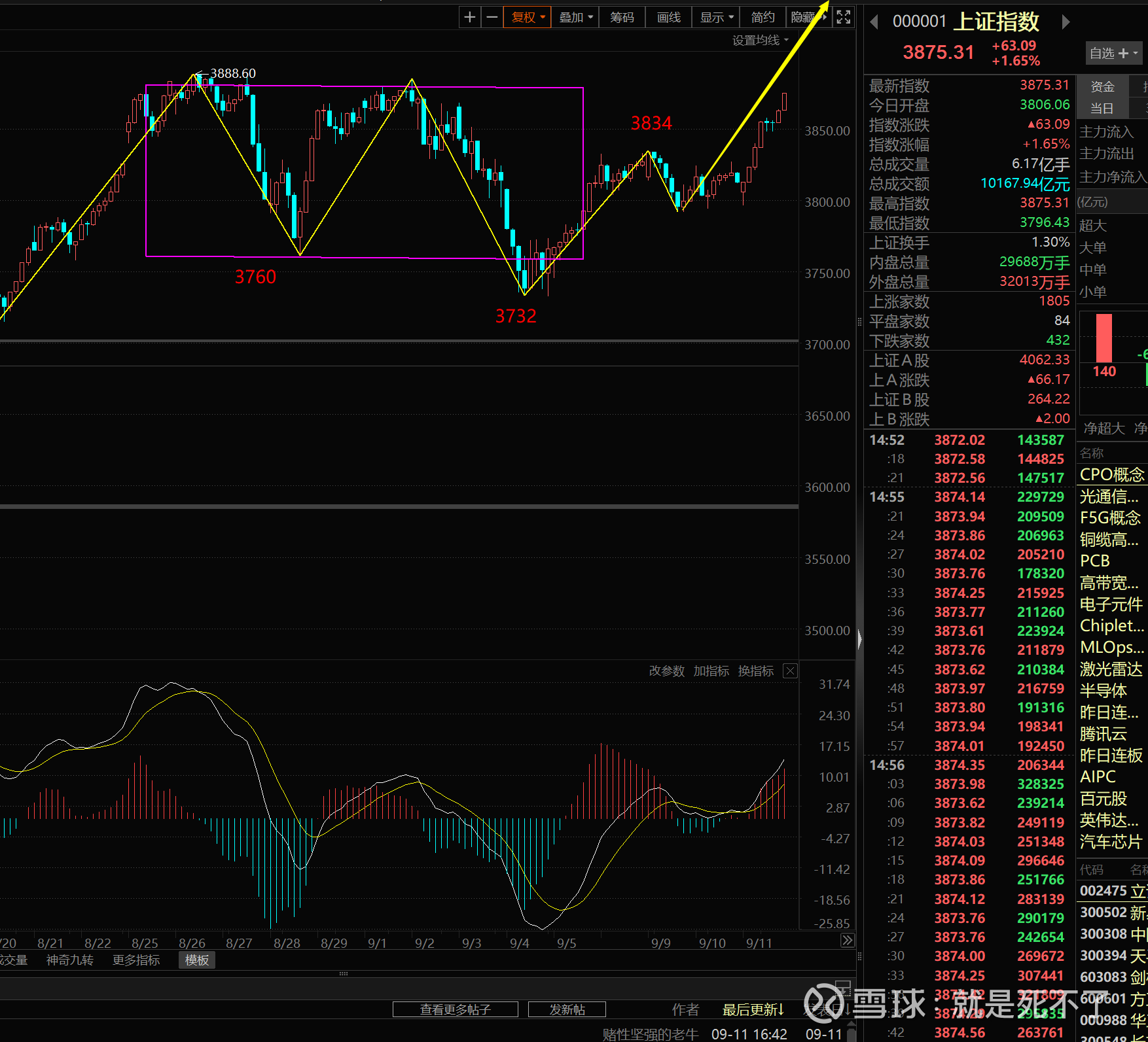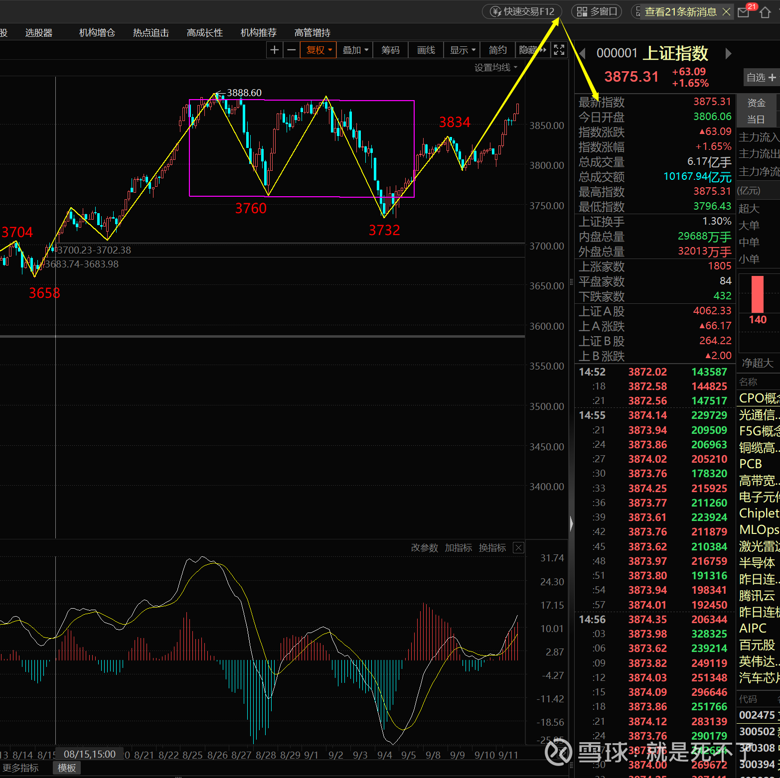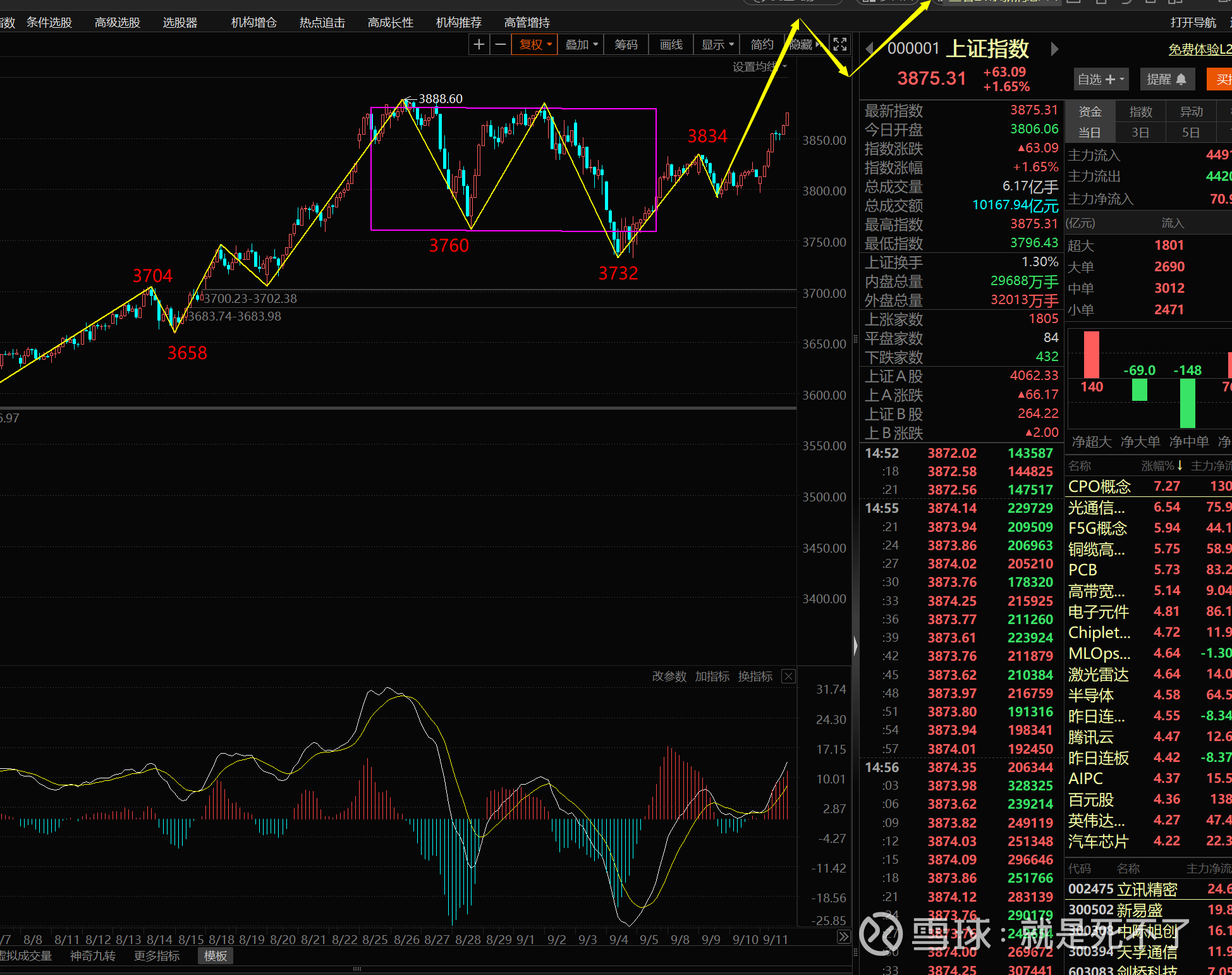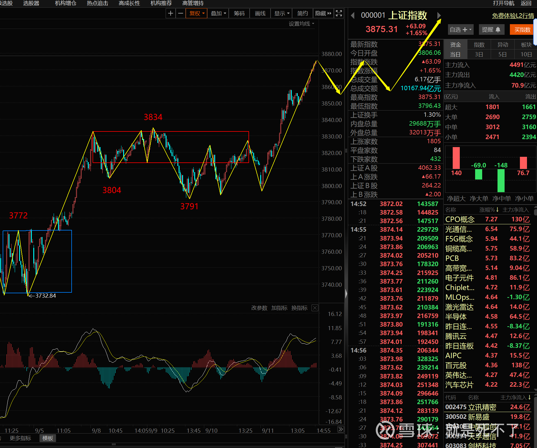 总的来说:明天指数往上冲新高后容易引发背驰产生5分钟的一笔回踩,只要不破3834,就继续看涨。