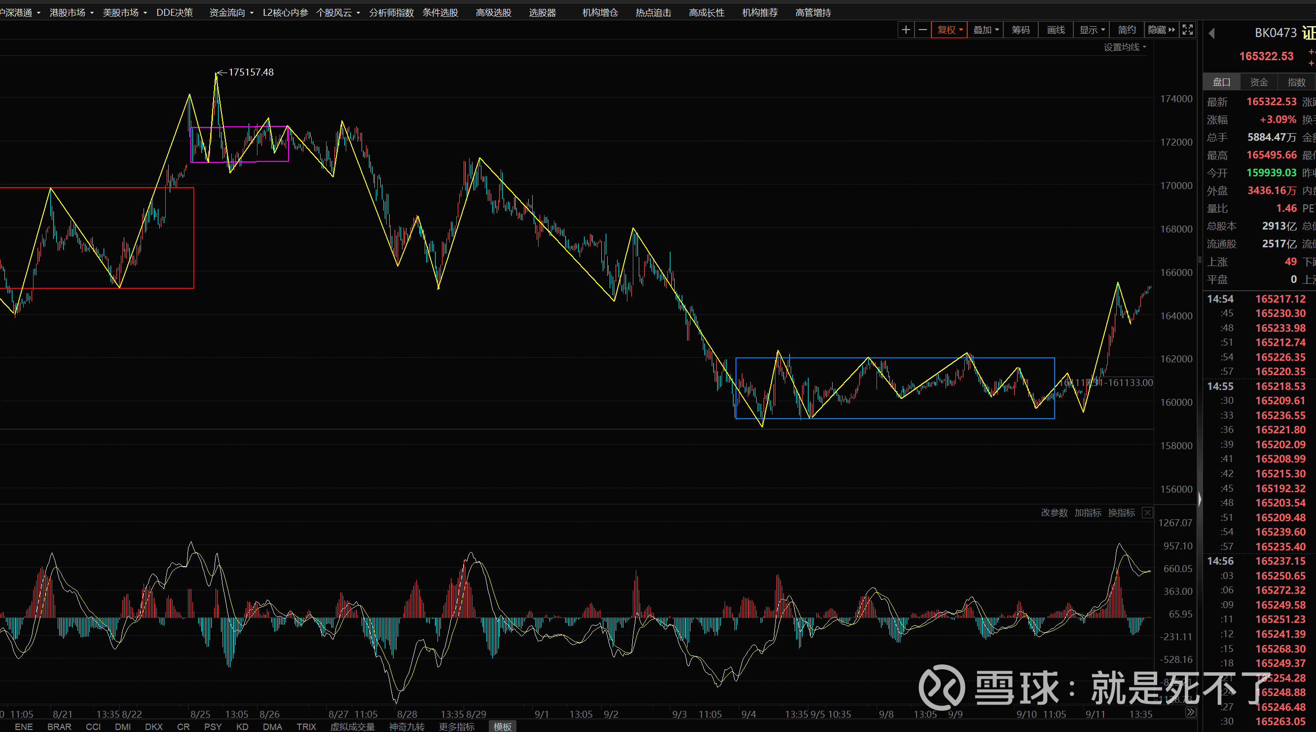 现在开始分析指数,先看5分钟,今天的5分钟上涨走势完美符合我昨天的预判,
