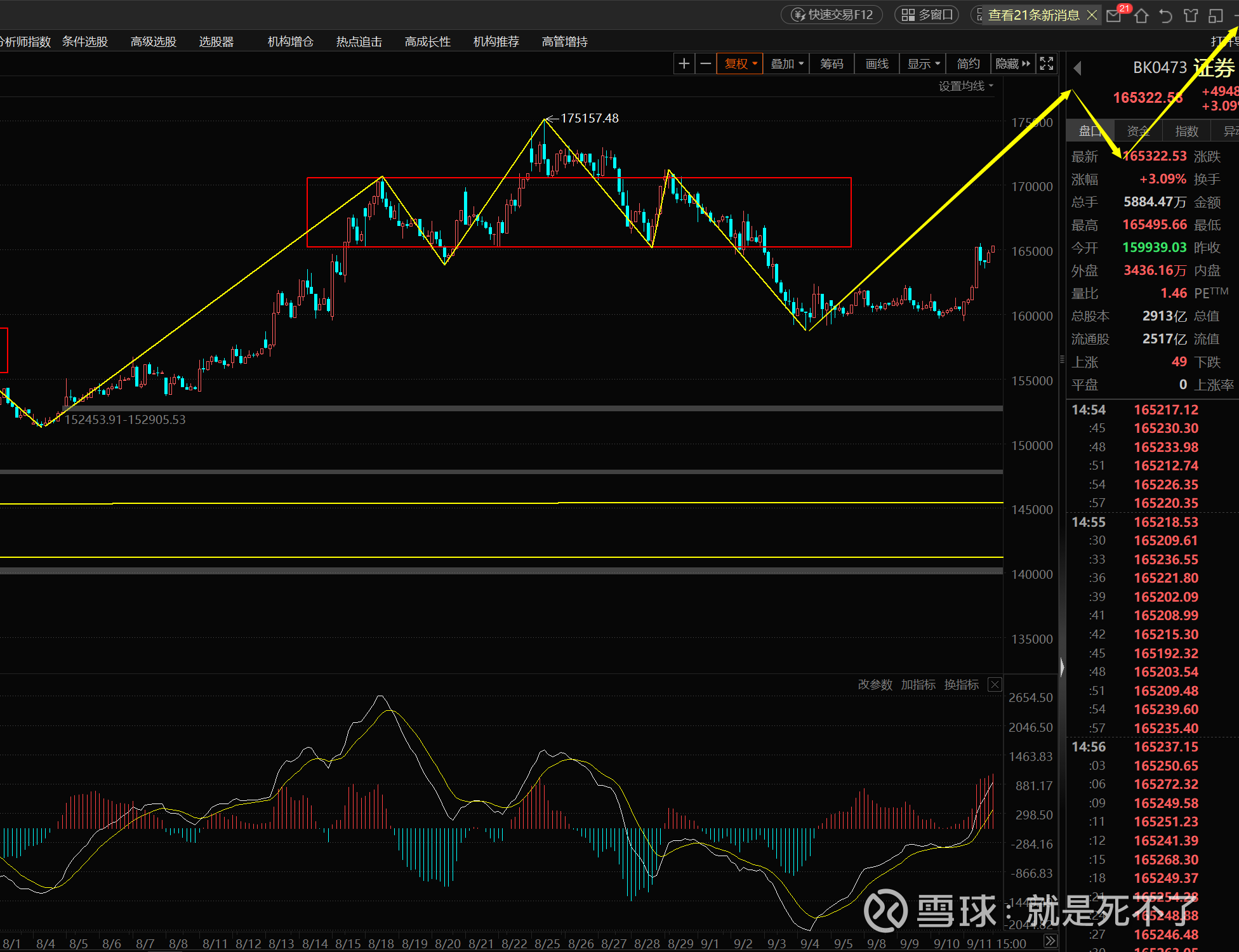 券商明天指数往下回踩的时候可能还会震荡一下,但是底部已经确认,接下来就是往上走创新高的过程,它只要发力,就会直接开启几百点的主升行情。