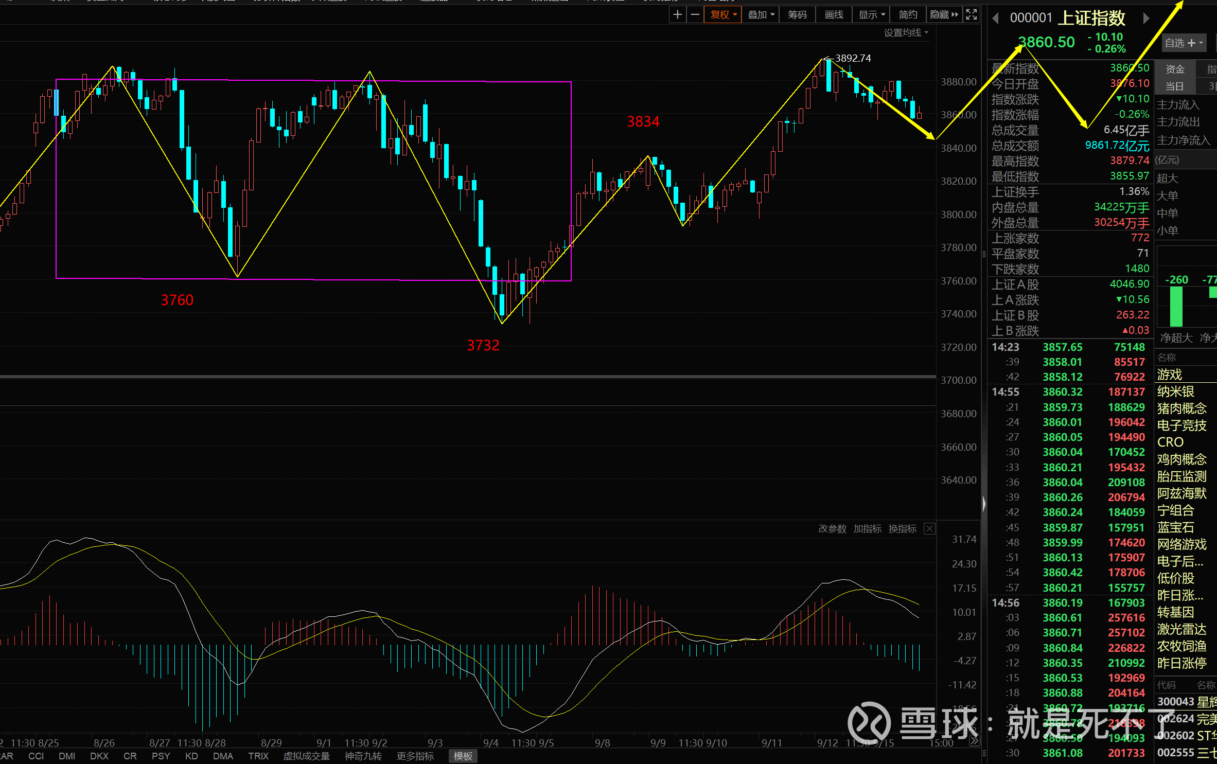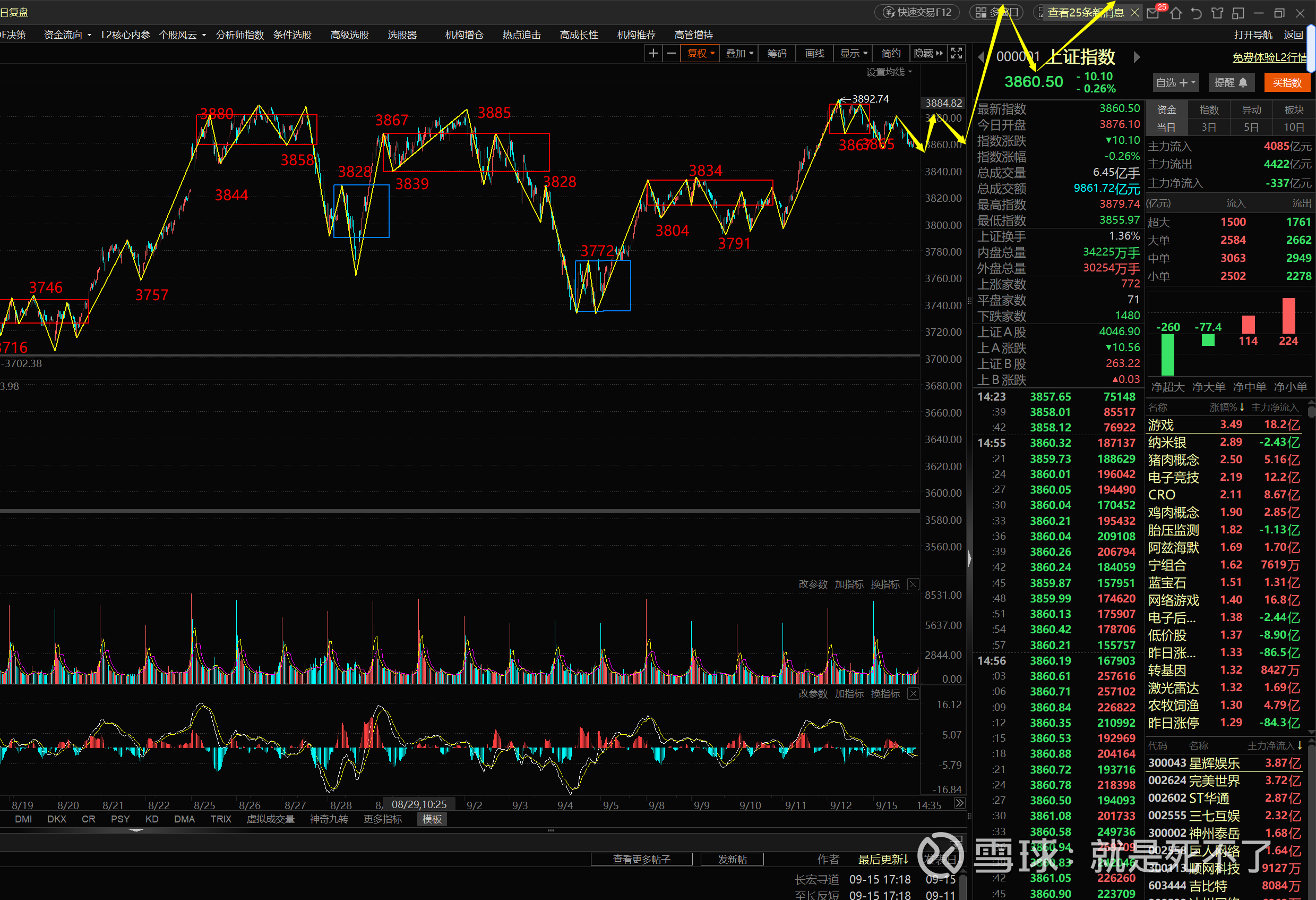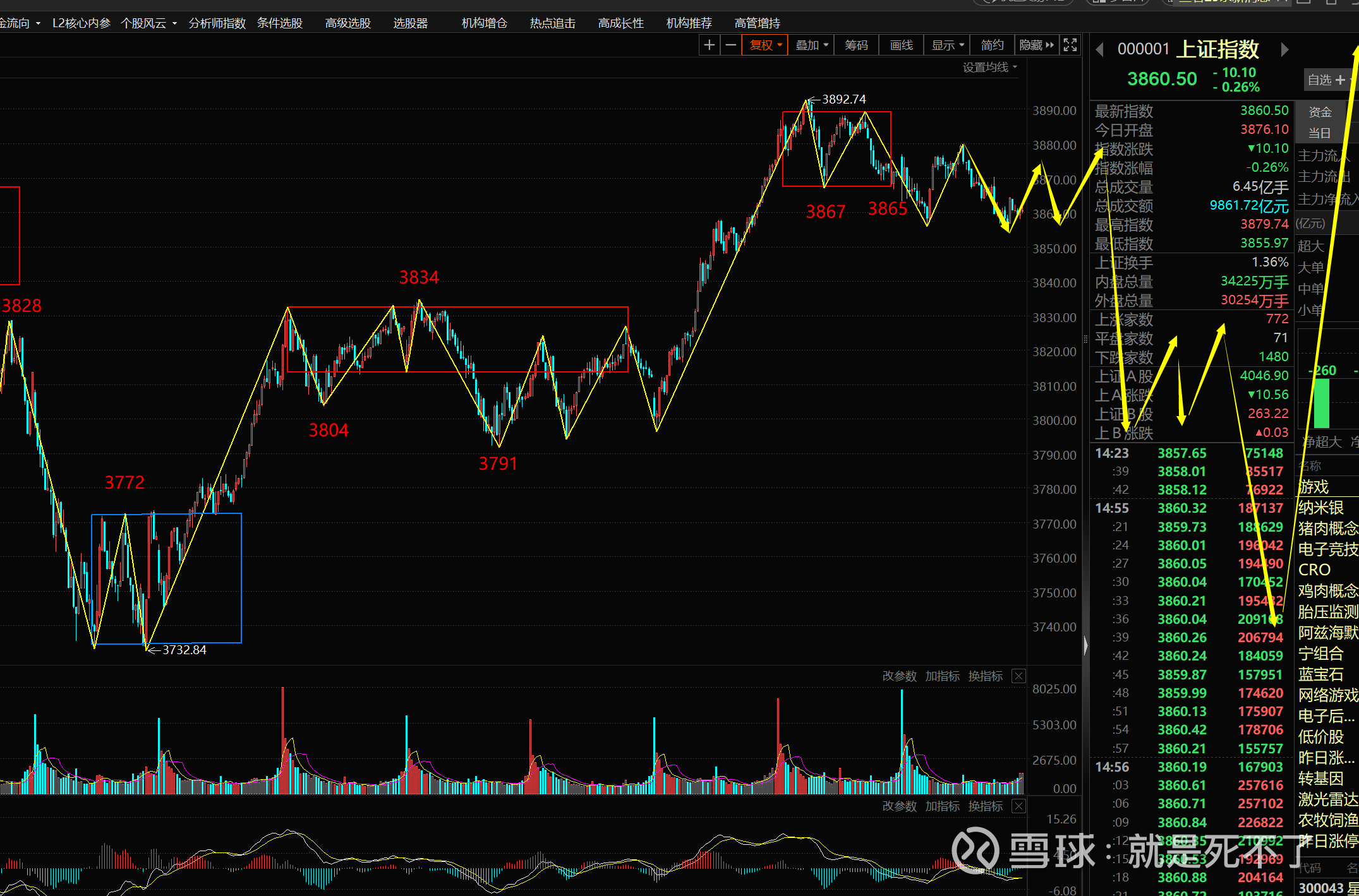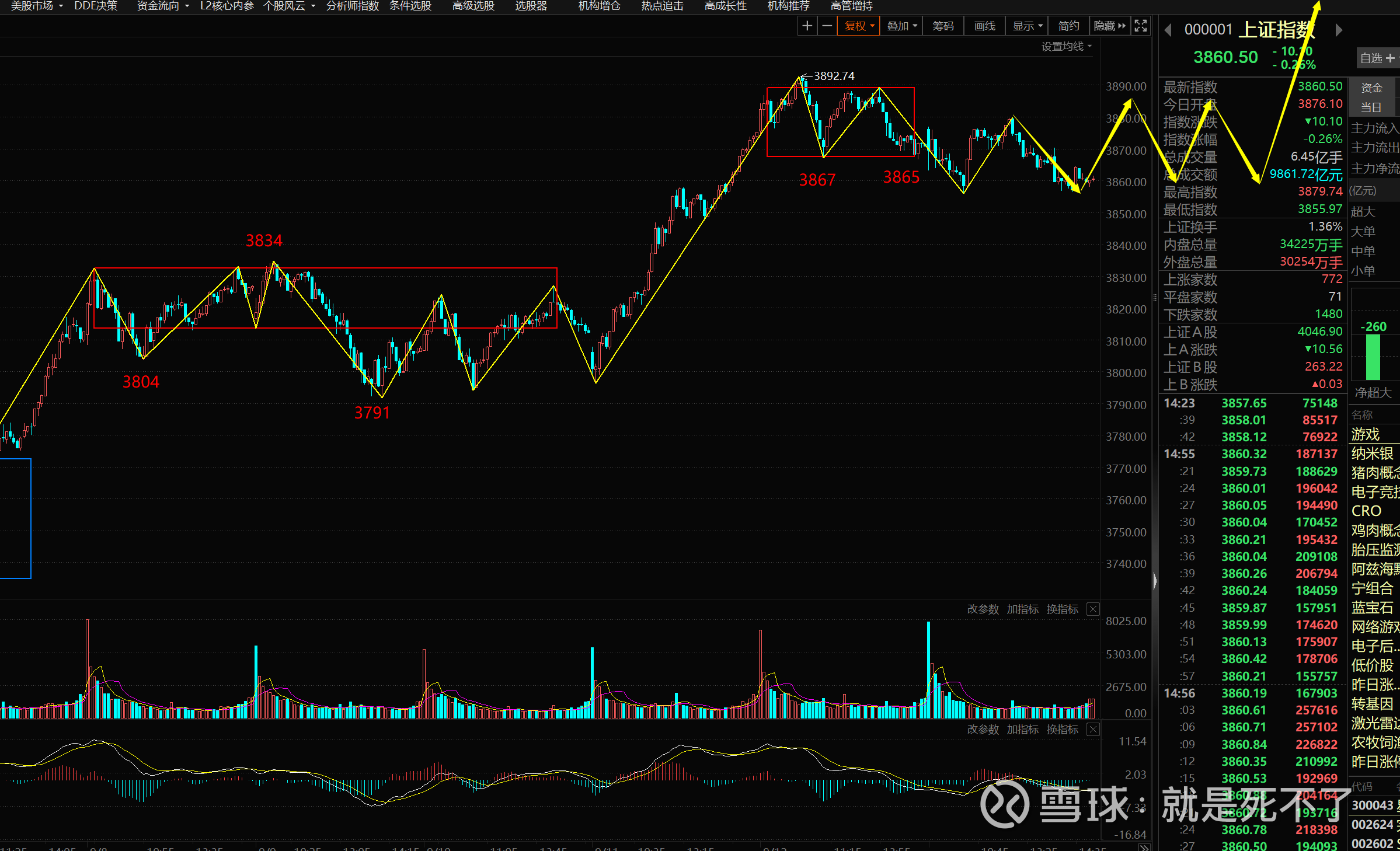 今天指数维持震荡,下面是5分钟图,上周前半周也是一个5分钟的震荡,反复跌破3804后被拉回就开始往上。