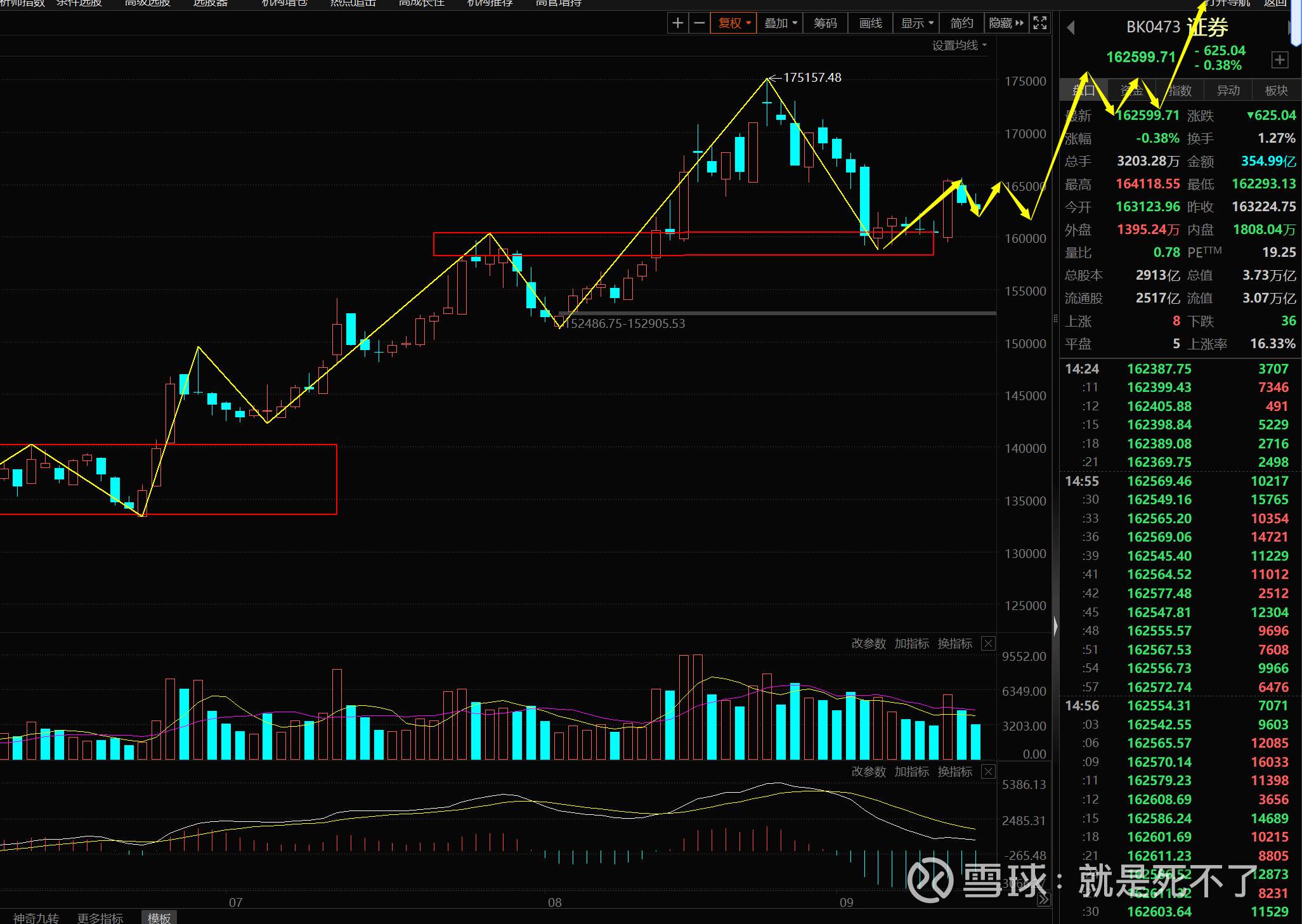 证券目前看完成整理结构后往上涨到前高,然后继续整理。