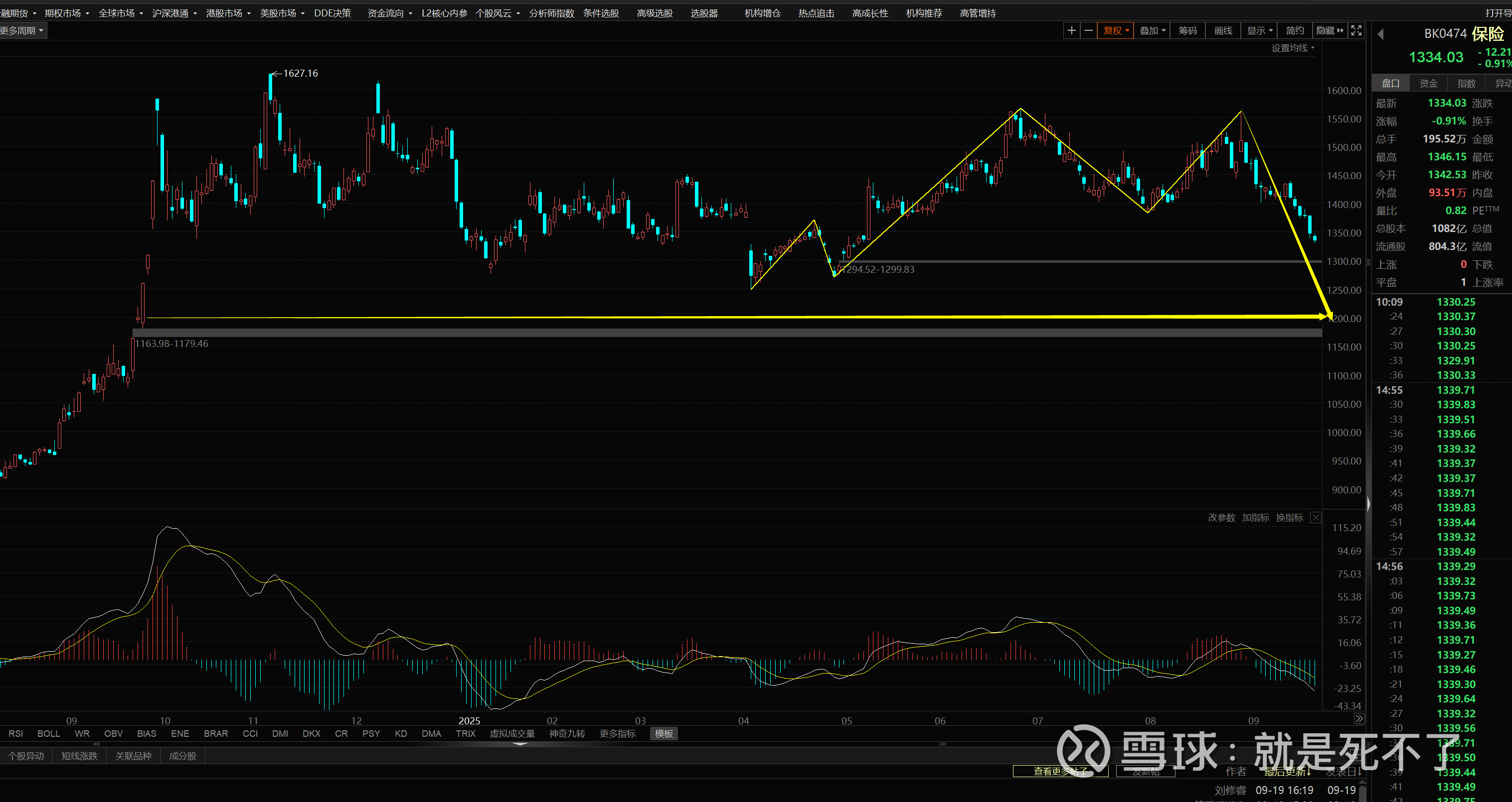 保险,日线M头破位,如果按照颈线破位的理论测算,要跌到1200点。