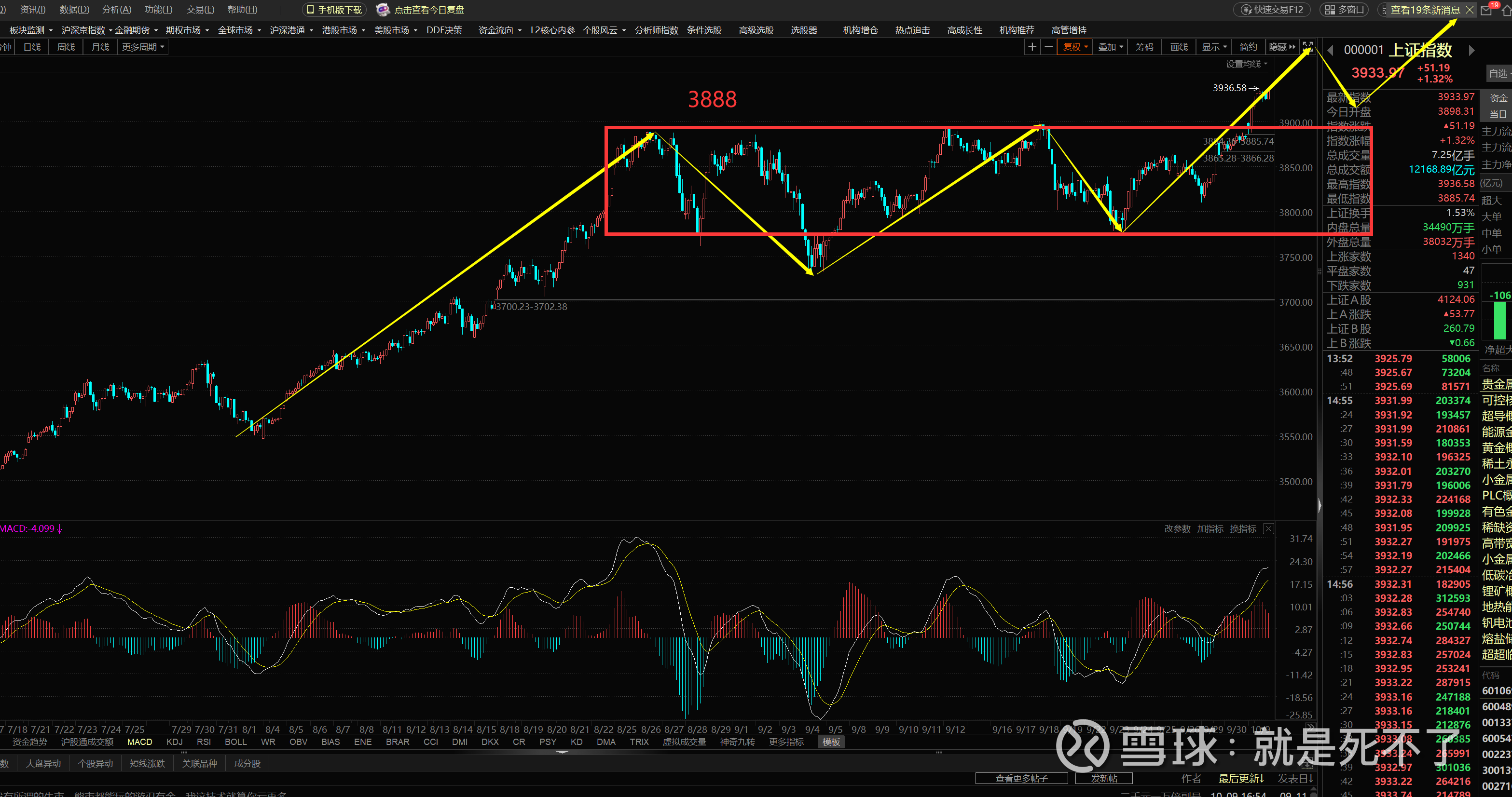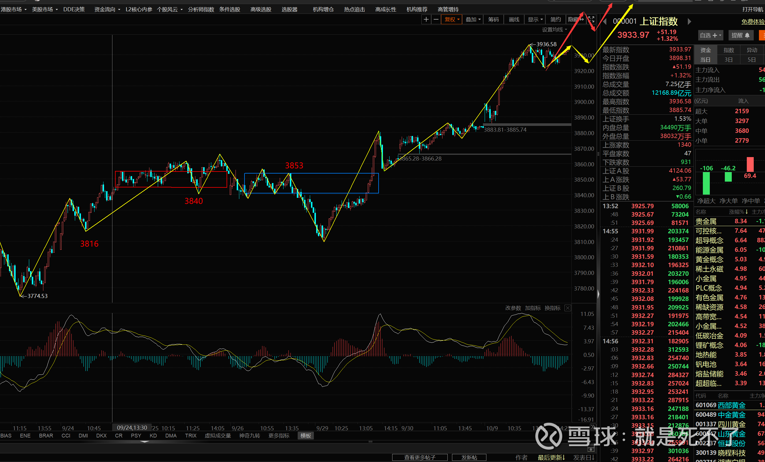 主力资金已经在9月份完成了高低切,接下来还差一步,就是上证指数出现5分钟和30分钟回抽3888或者简单点3900点的动作。