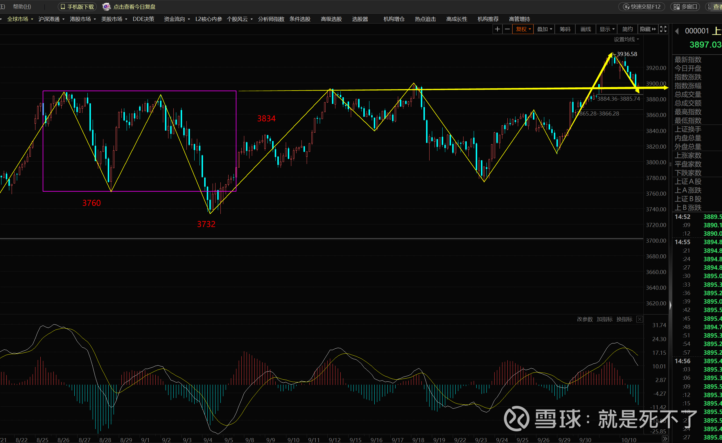 上证指数30分钟图,今天跌破了3888重新回到了9月份的震荡