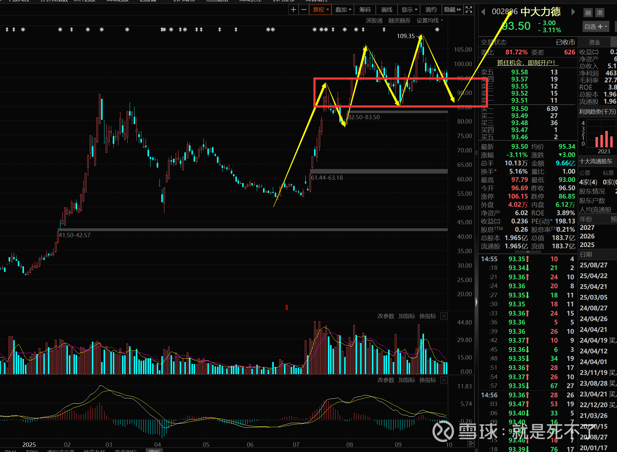 我以中芯为例,它这笔下跌是去做3买的。但是如果3买转2卖,就是跌完后无法继续创新高,并且2卖的高度很低,那它后面基本就凉了。