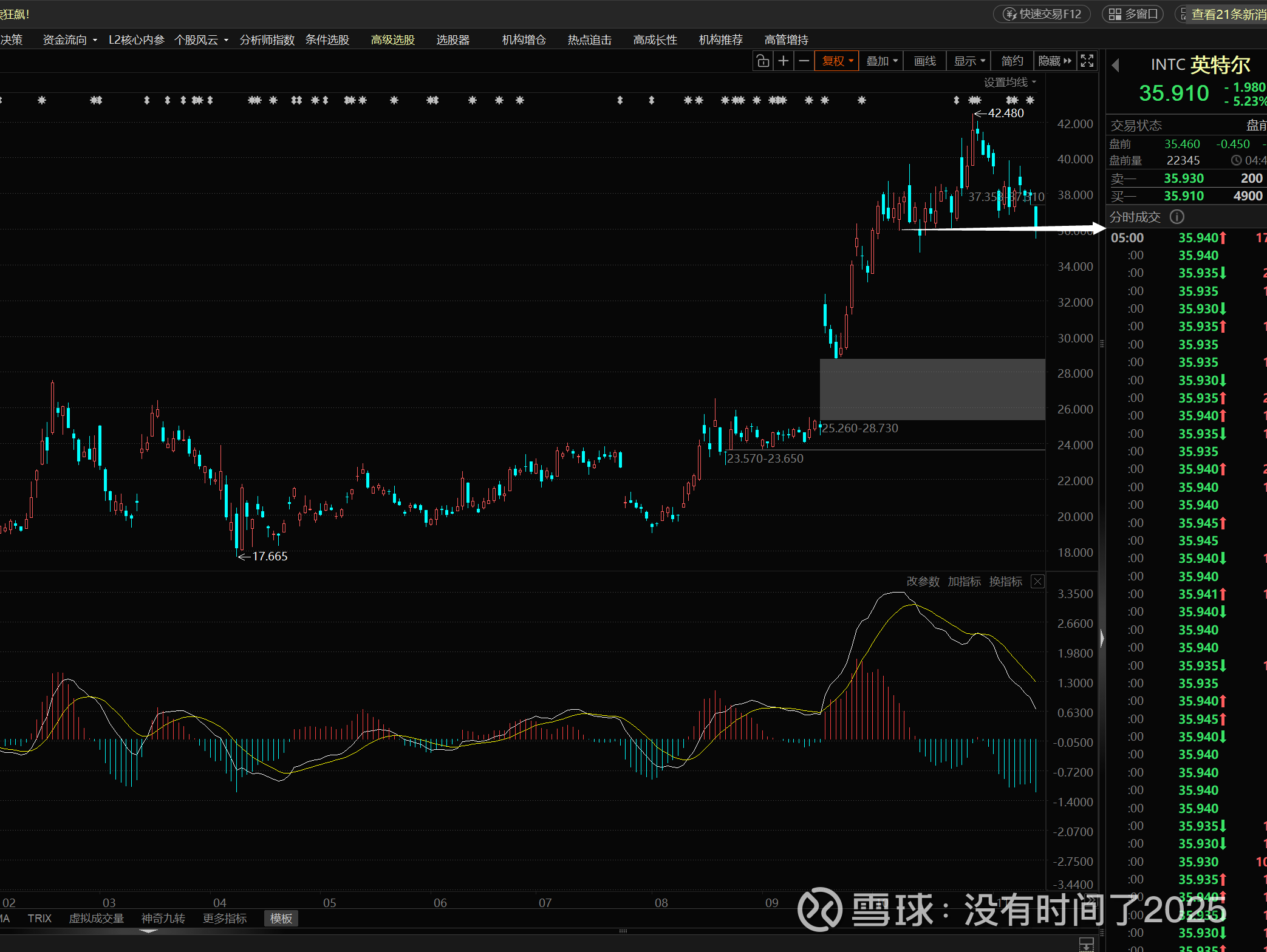 英特尔,说的严格点已经破位了,给它宽松点,还没破。看它今天晚上的表现