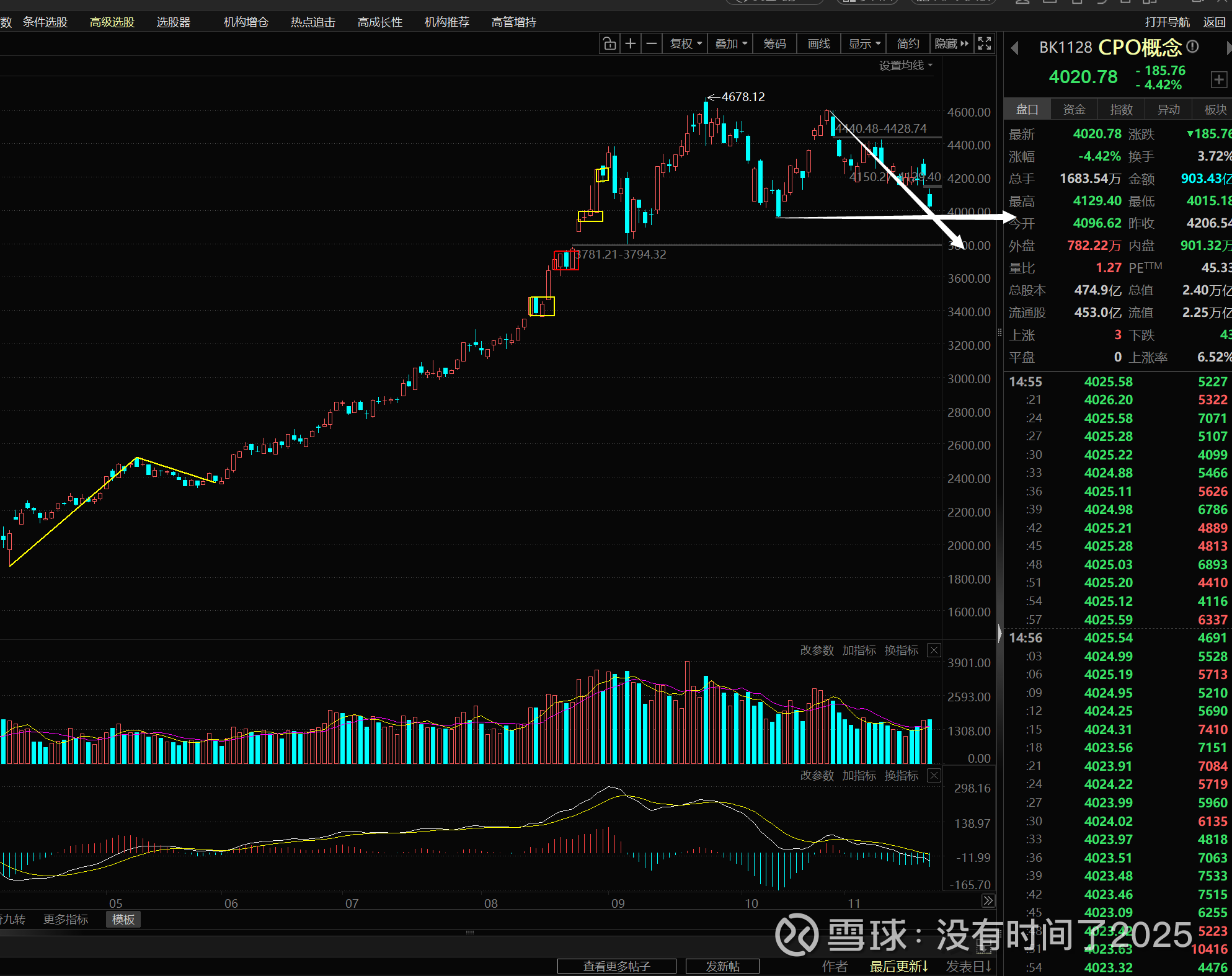 CPO,日线,很强,其实是内部某个股票导致的板块强势,其他股票早就破位了。从创业板指数还无法确认止跌来反推CPO,我估计CPO未来破位的可能性不小。