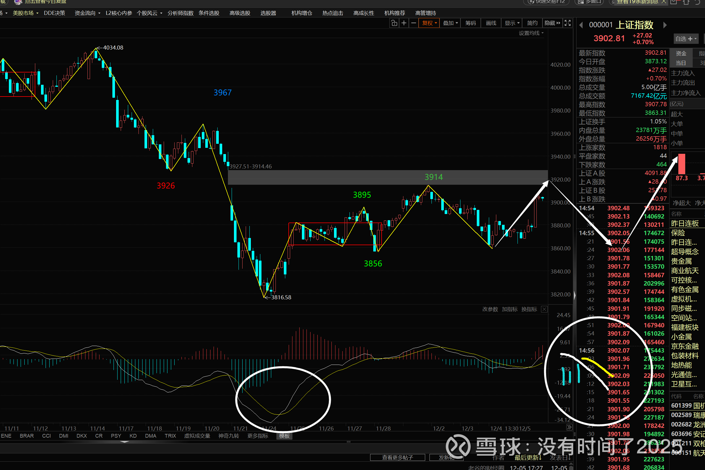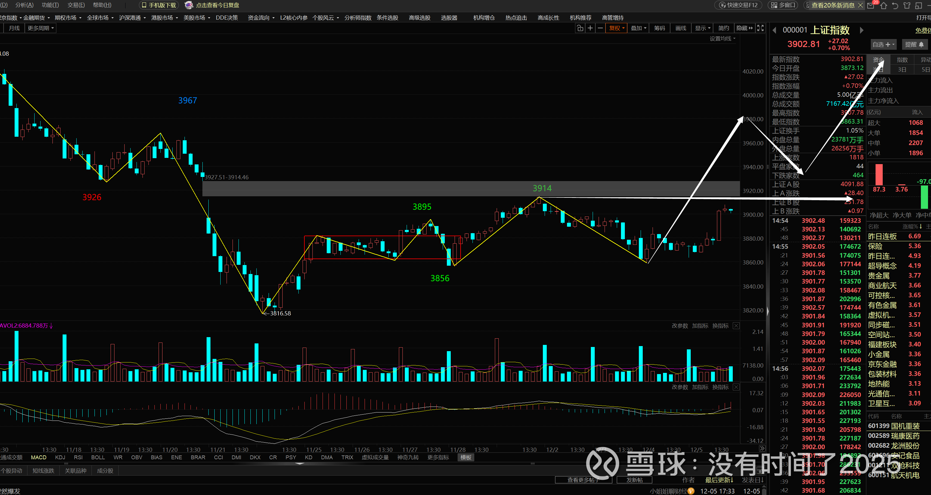 下图30分钟的MACD的黄白线和绿柱子,因为11月21日的跌幅很大,所以下周初如果跌破3859,只有大暴跌才会力度不背驰,让下跌走势延申。