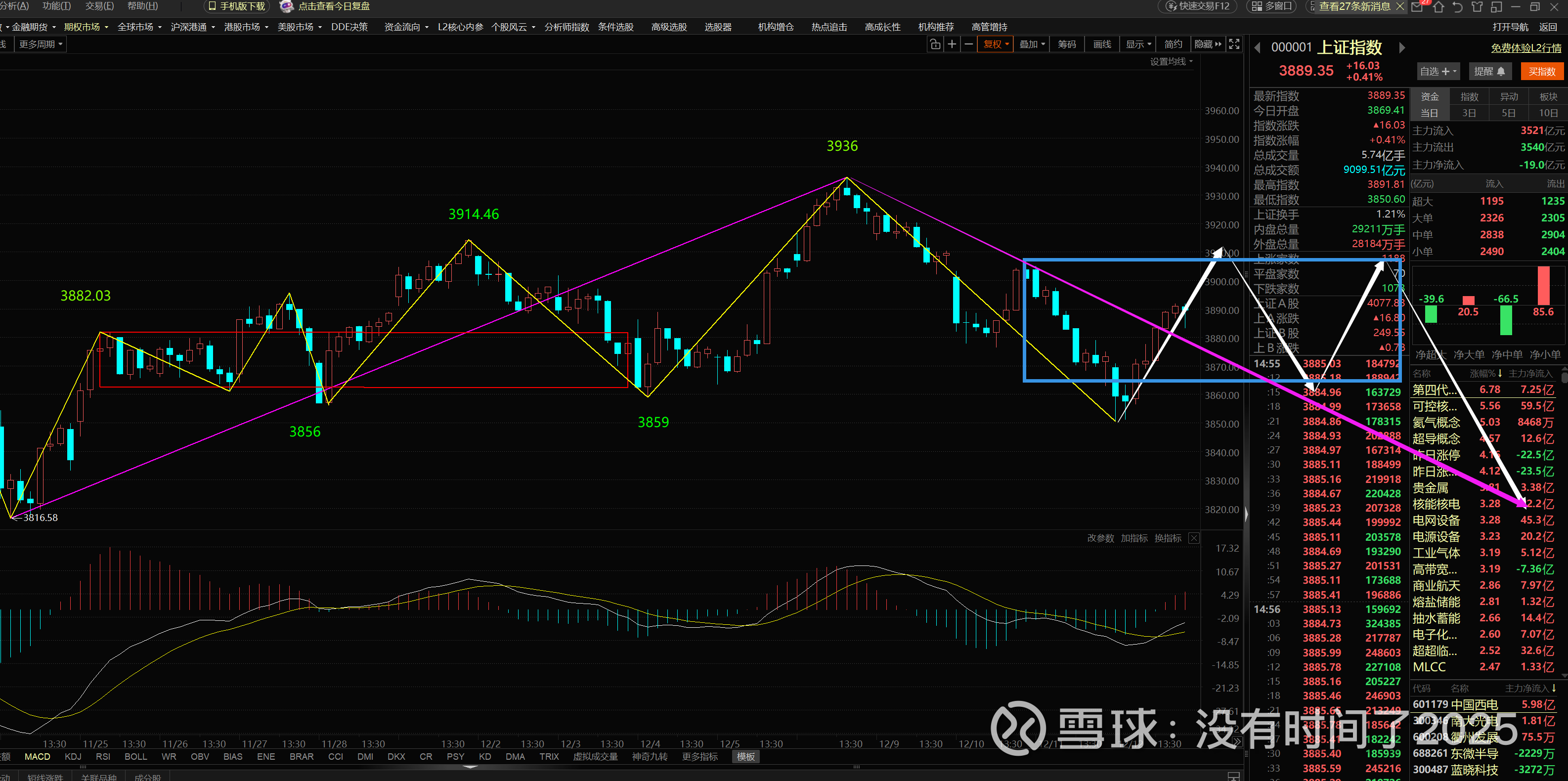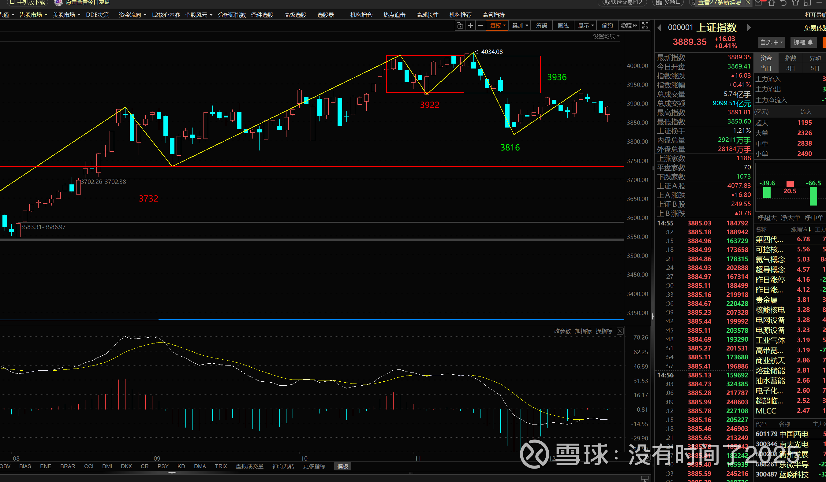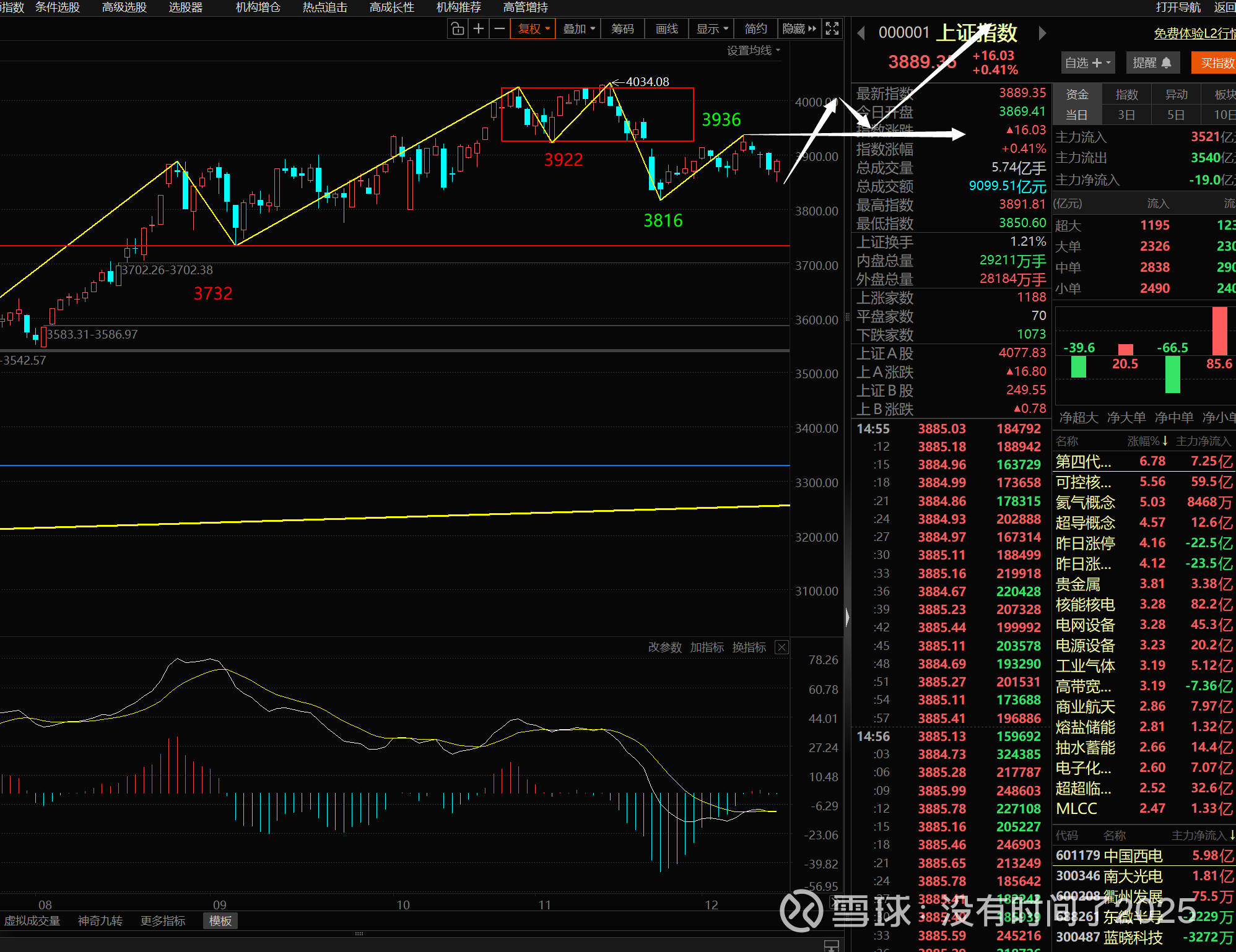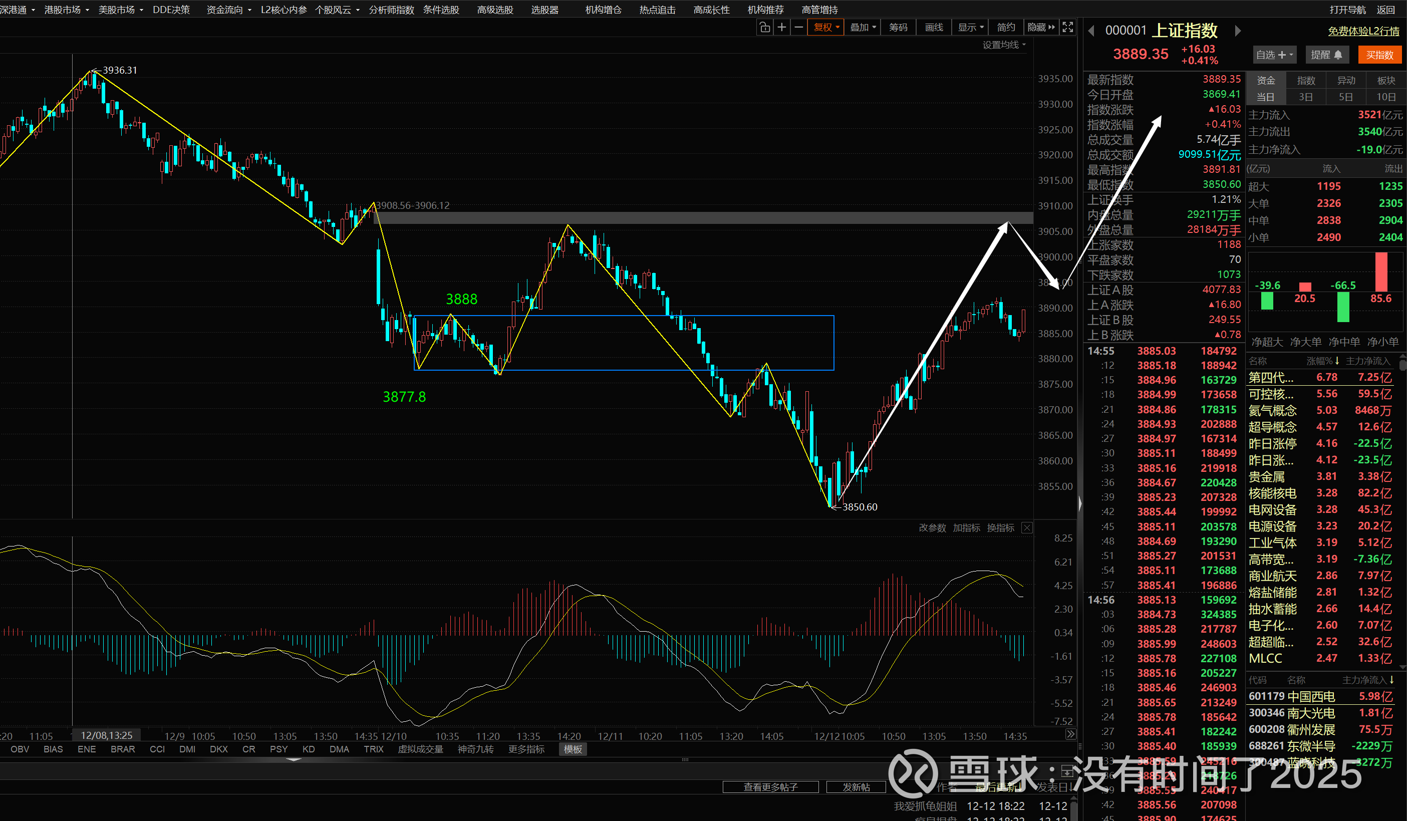 创业板为首的科技股,包括半导体,今天打到3买的位置止跌后出现了反弹,带动指数在3850止跌后反弹,创业板下周初要向上走离开段。
