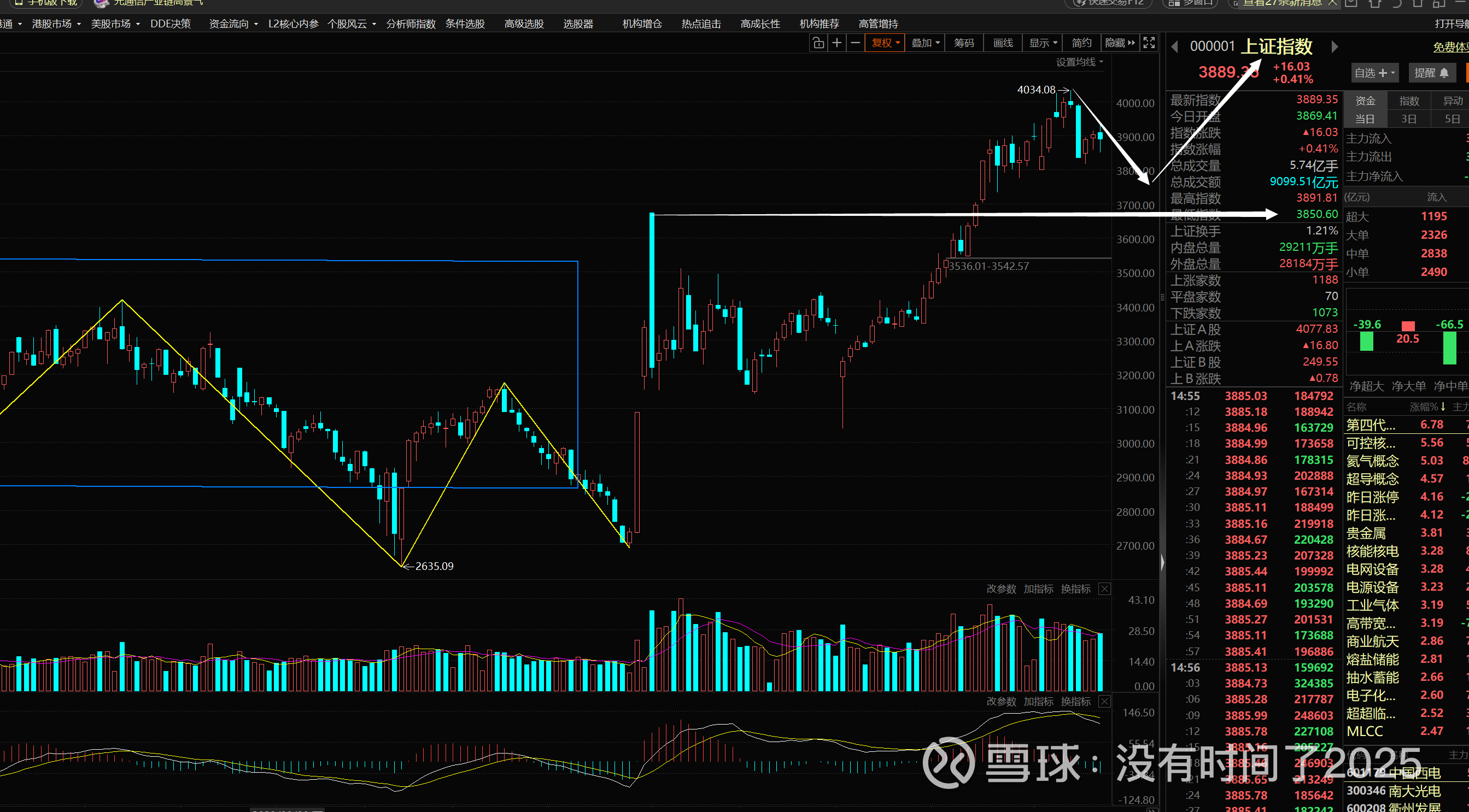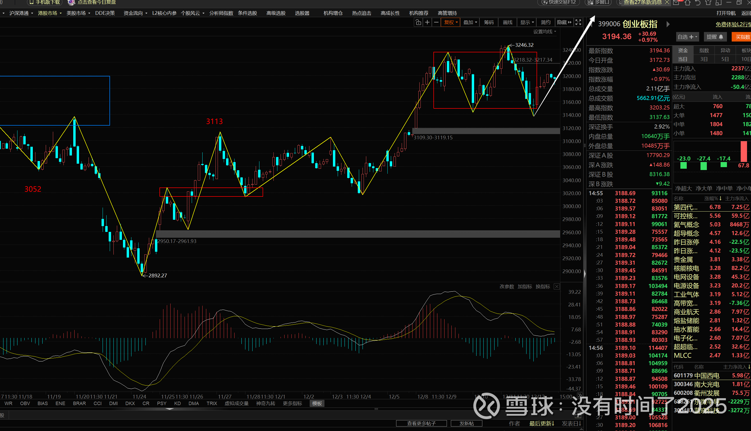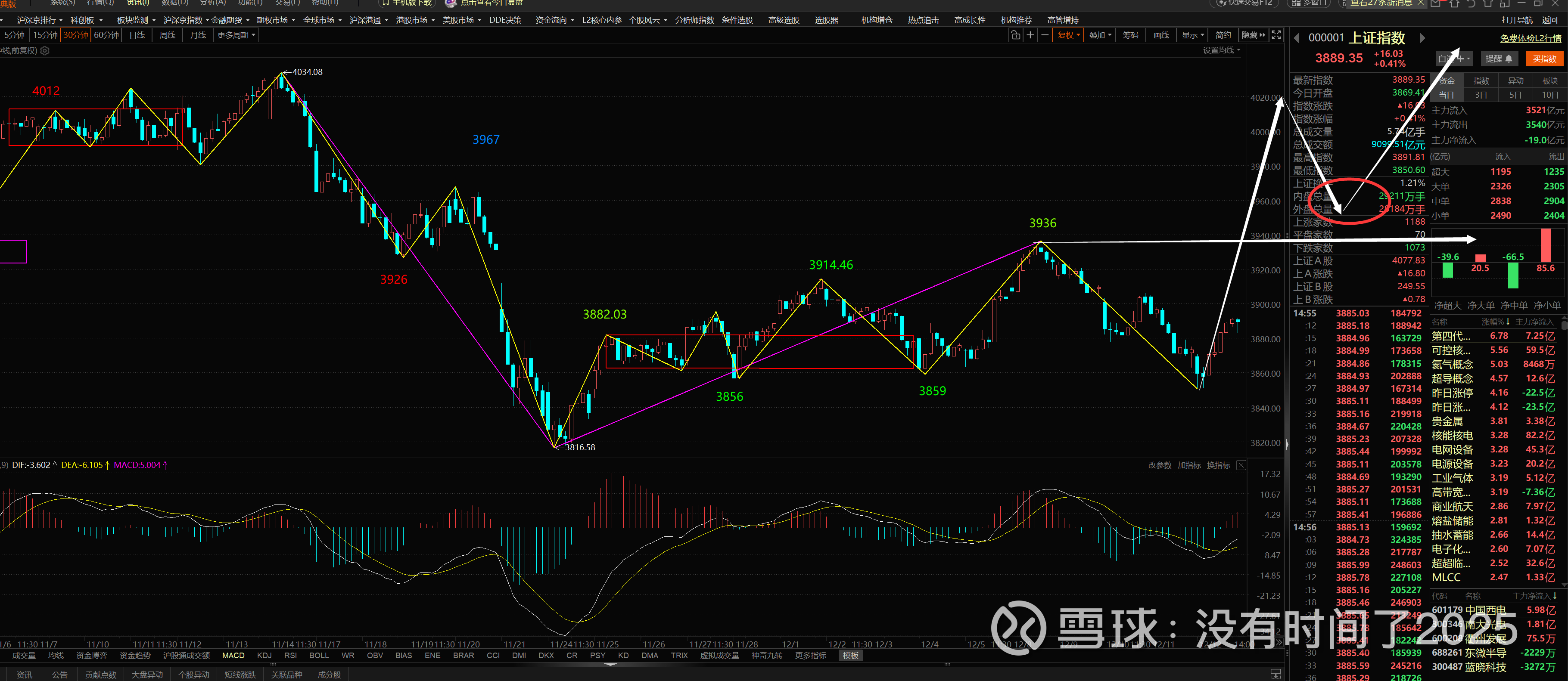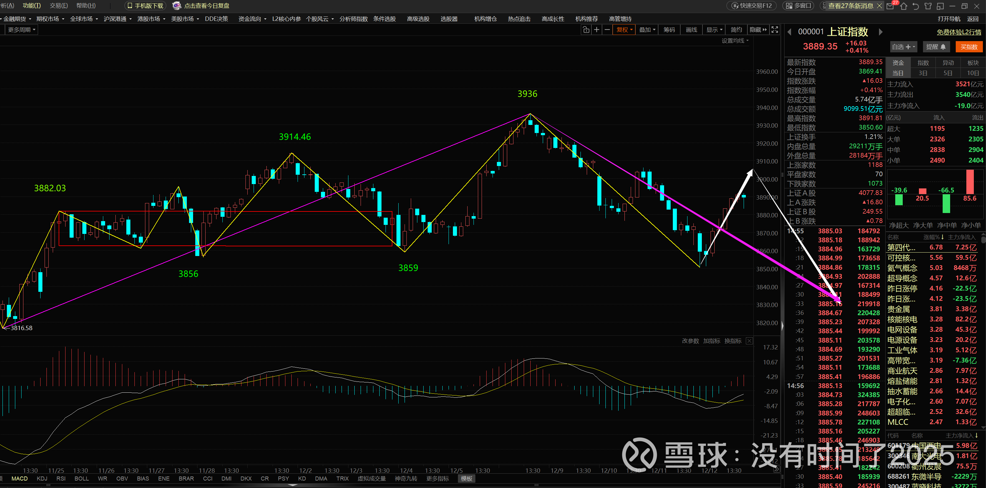 创业板为首的科技股,包括半导体,今天打到3买的位置止跌后出现了反弹,带动指数在3850止跌后反弹,创业板下周初要向上走离开段。