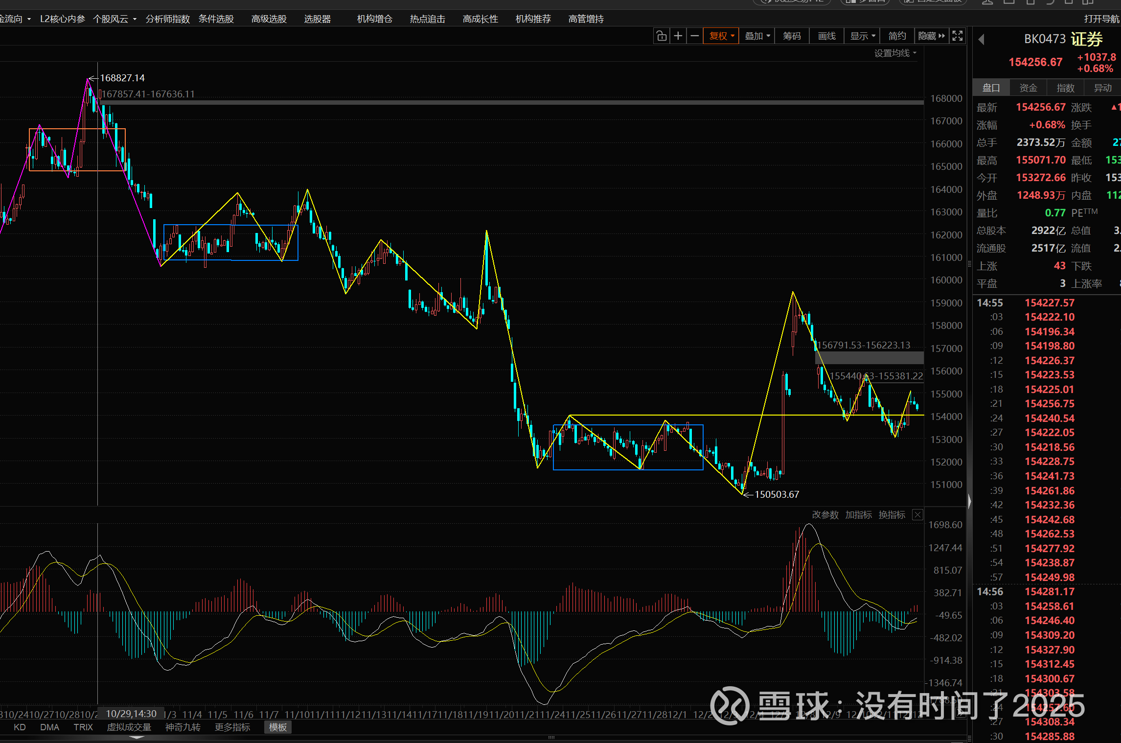 如果今天这里起来的反弹力度弱,就会变成日线下跌中的30分钟的结构,有两种,线段和中枢。