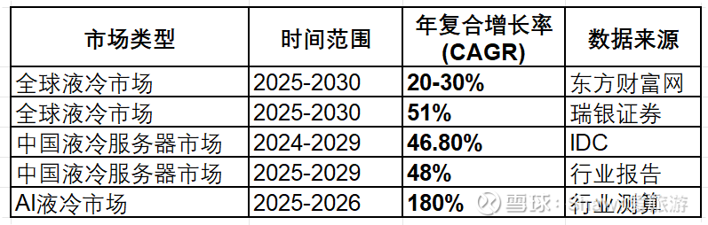 • 2025-2030年全球CAGR20-51%(机构口径不同),中国46.8-48%(液冷服务器)。
