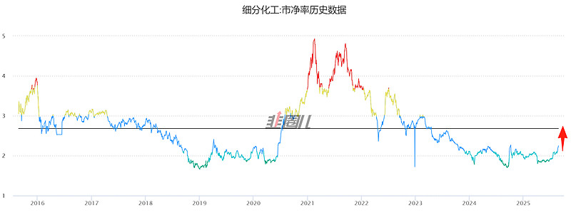 再看估值,截至2025.8.26,细分化工指数市净率PB为2.25倍,处于近10年的36%分位,即“偏低估”区间,距离均线都还差一截。(要知道在2021年高位时,PB估值近5倍)