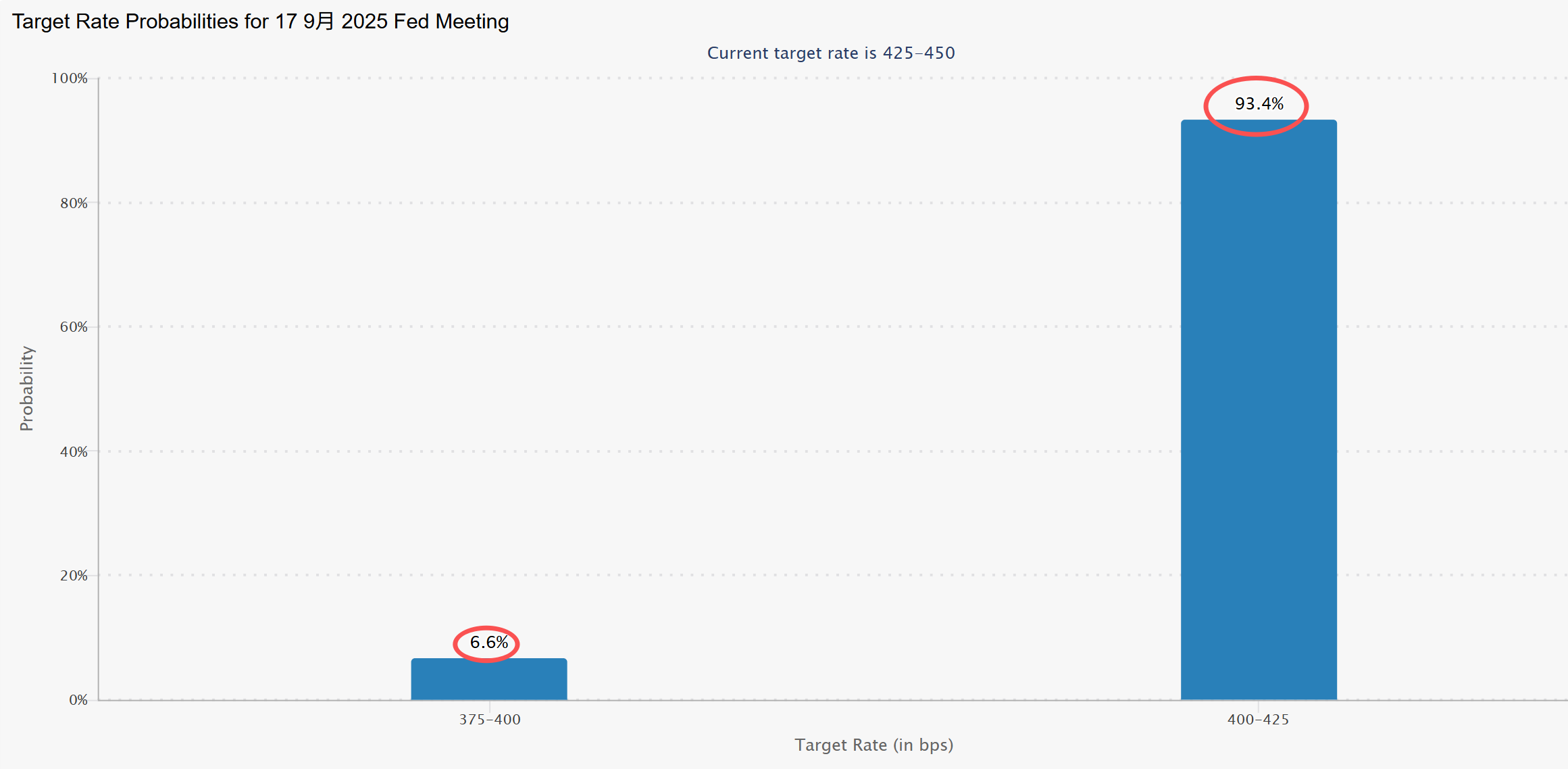 美联储下一次FOMC会议将在9月17日举行,目前有93.4%的概率预测9月降息25个基点,6.6%的概率降息50个基点。
