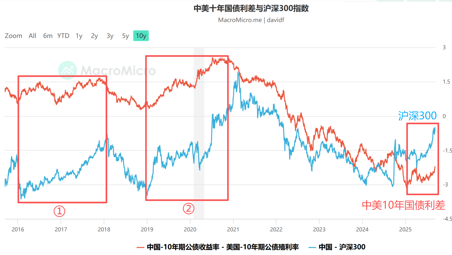 从近10年来看,“中美10年国债利差”与“沪深300”的走势相当一致!