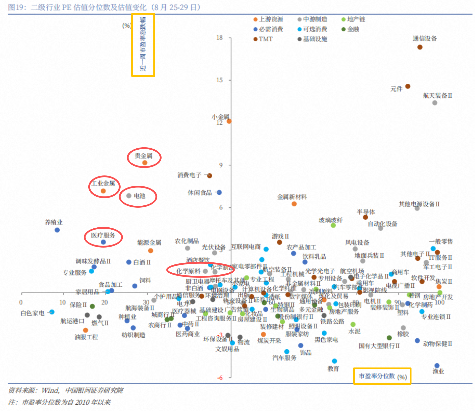 处于“第一象限”的行业不算多,总结起来有6类:金属、消费、电池、化学、养殖、医疗。