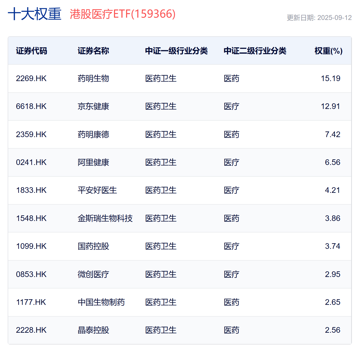 无论是上面提到的CXO龙头(药明生物、药明康德)还是AI医疗龙头(京东健康、阿里健康、平安好医生),都是港股医疗ETF(159366)的重仓股(对应场外基金024861)