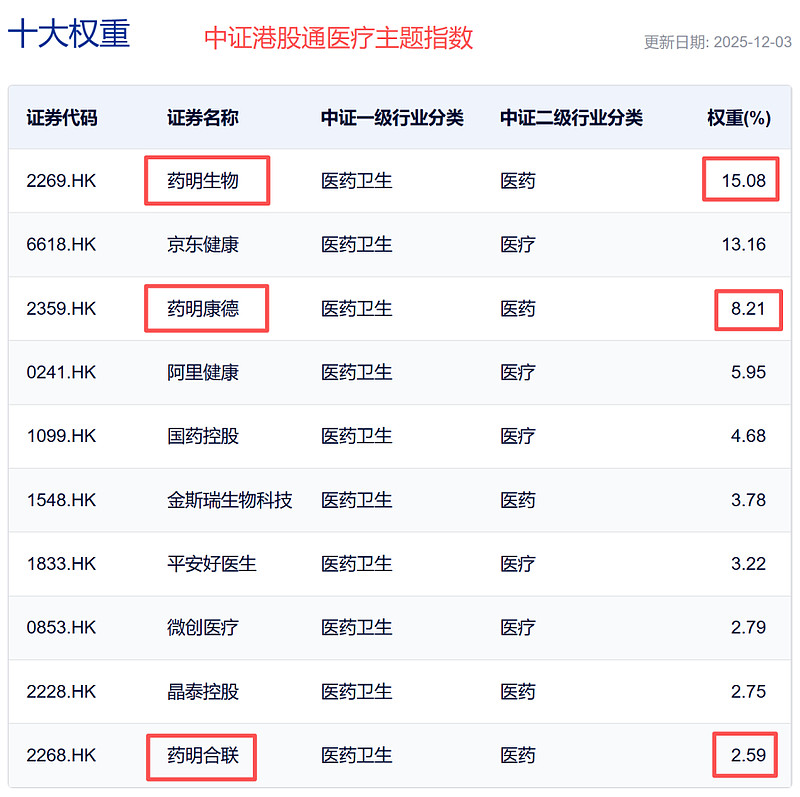 这3个CXO龙头股均为“中证港股通医疗主题指数”的前10大重仓股!