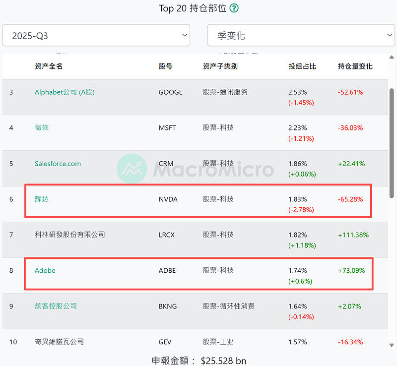 不仅是付鹏开始关注“AI应用”,之前给大家提到过的全球最大对冲基金“桥水基金”在Q3调仓中,也大幅减仓AI基建端的英伟达,转向大幅加仓AI应用端的Adobe。