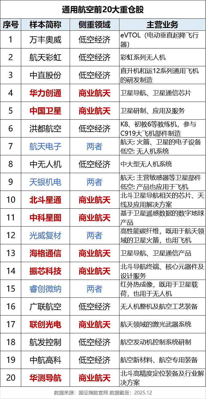 “通用航空”的前20大重仓股中,有8只侧重低空经济、8只侧重商业航天,4只是两者都涉及。