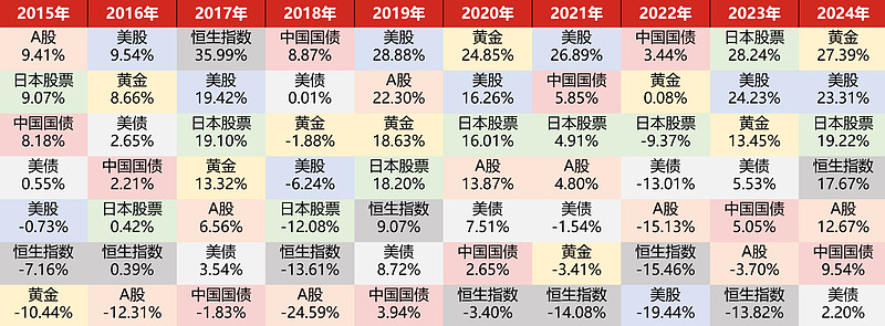 这张图主要是想告诉大家:各类资产都存在周期效应,没有哪个单一资产能持续表现靠前。想要降低投资组合的整体波动,提升投资