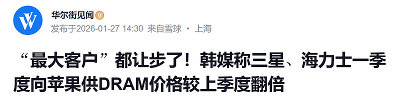 1月27日,三星电子与SK海力士已完成和苹果的谈判,将大幅上调今年第一季度供应的苹果iPhone低功耗DRAM价格。其中,三星报价较前一季度涨幅超过80%,SK海力士给出的涨幅接近100%!