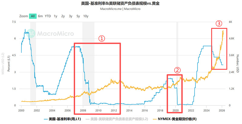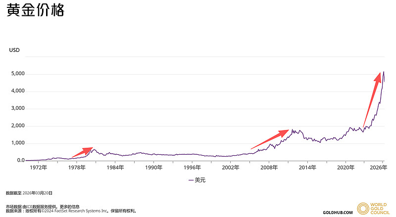 三是目前我们正在经历的,从2020年的1600美金一路涨到2026年1月的5400美金。也是涨了3倍多。