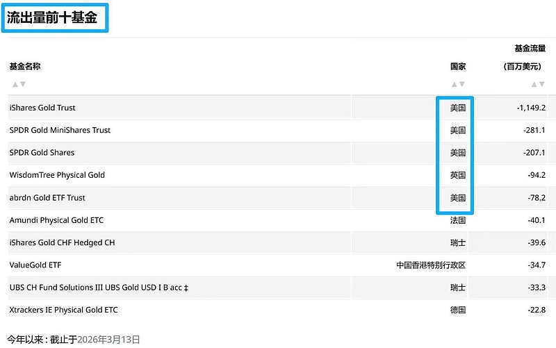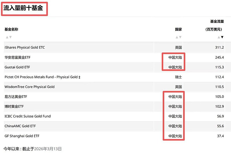 截至3月13日的那一周(也就是冲突爆发后的第三周,黄金跌破5000大关),流入量前10的黄金基金中,中国大陆占了7只基金,这些黄金ETF是散户持有居多。