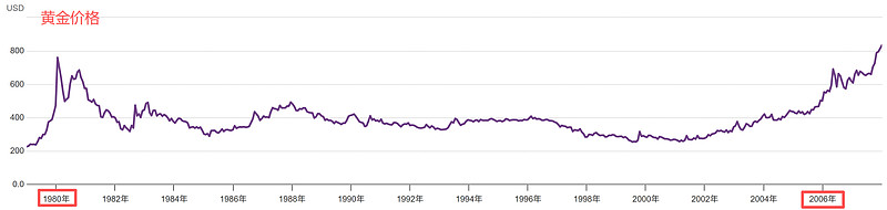 一是1978-1980年,金价从200多美金涨到了近800美金,涨了3倍多。随后,又跌到200多美金,跌幅高达70%!直到2006年才重新涨到800美金,中间经历了26年。