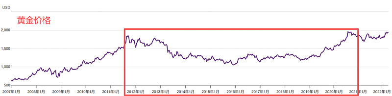 二是2006年-2012年,金价从500多美金涨到近2000美金,也是涨了3倍多。随后,2012年金价在接近2000美金的位置见顶,随后一路跌到1000多美金,跌幅近50%。直到2021年才重回2000美金,这个过程经历了10年。