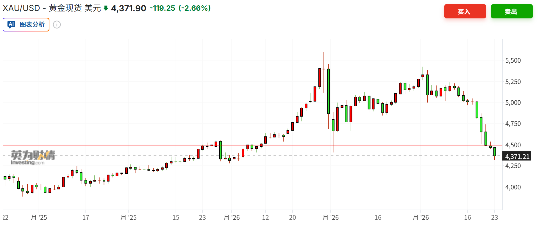 黄金现货价格在今年1月28日达到最高收盘价5400美金,截至3月20日收盘价跌至4491美金,从高位至今跌幅超19%!