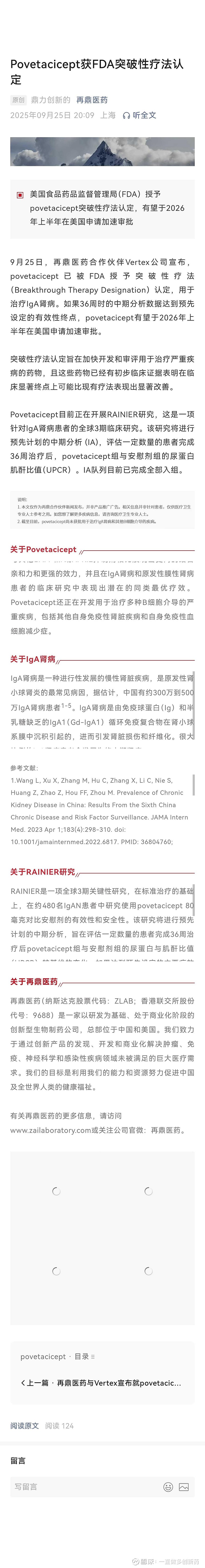 $再鼎医药(09688)$ 9月25日,再鼎医药合作伙伴Vertex公司宣布,povetacicept已被FDA授予突破性疗法(Breakthrough Therapy Designation)认定,用于治疗IgA肾病。如果36周时的中期分析数据达到预先设定的有效性终点,povetacicept有望于2026年上半年在美国申请加速审批。