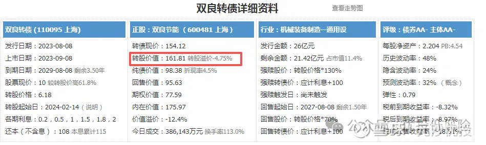 今早看了一下双良节能的股价,开盘刚好跌了4%,说明很多人是参与了这个折价套利,现在股价跌幅收窄了,反倒是可转债在涨,估计是昨天跌过头了,现在回调一些。