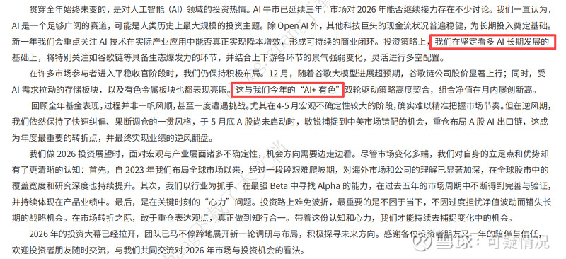 11月月报显示信息技术还占80%,12月降到52%,加到了材料(有色)26年依然坚定看多AI长期发展的,以行业为抓手、在最强Beta中寻找AIpha的能力。