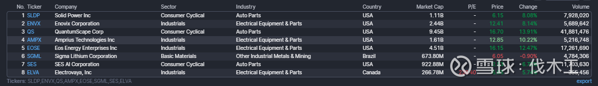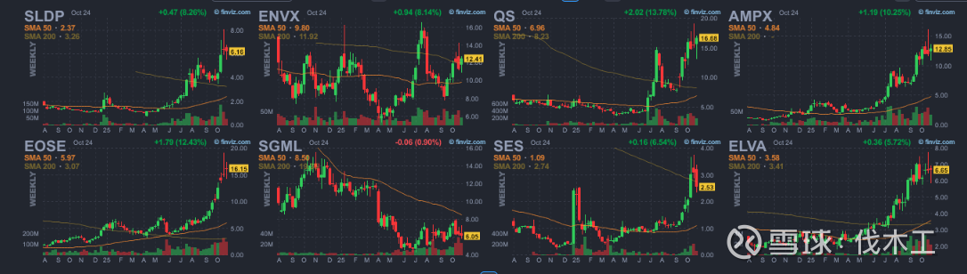 2025年10月,这些股票(SLDP、ENVX、QS、AMPX、EOSE、SGML、SES、ELVA)大多属于先进电池和能源存储板块,正处于集体反弹中。核心驱动是中国电池出口管制新闻(10月11日Bloomberg报道,美国-中国贸易谈判中,中国加强电池材料出口限制,提供美国本土供应链杠杆),这利好美国制造的电池技术股,叠加IRA(通胀削减法案)和BIL(两党基础设施法)激励、AI/数据中心/国防能源需求,以及EV供应链本土化主题。 X平台上,电池股提及量10月激增3倍,多帖讨论“美国锌/硅/固态电池取代锂依赖”,如锌电池“无火险、美国制造”叙事。 板块整体上涨15-40%,但波动大(microcap易炒作)。以下逐股拆解10月炒点(基于10月1-25日新闻/X情绪):