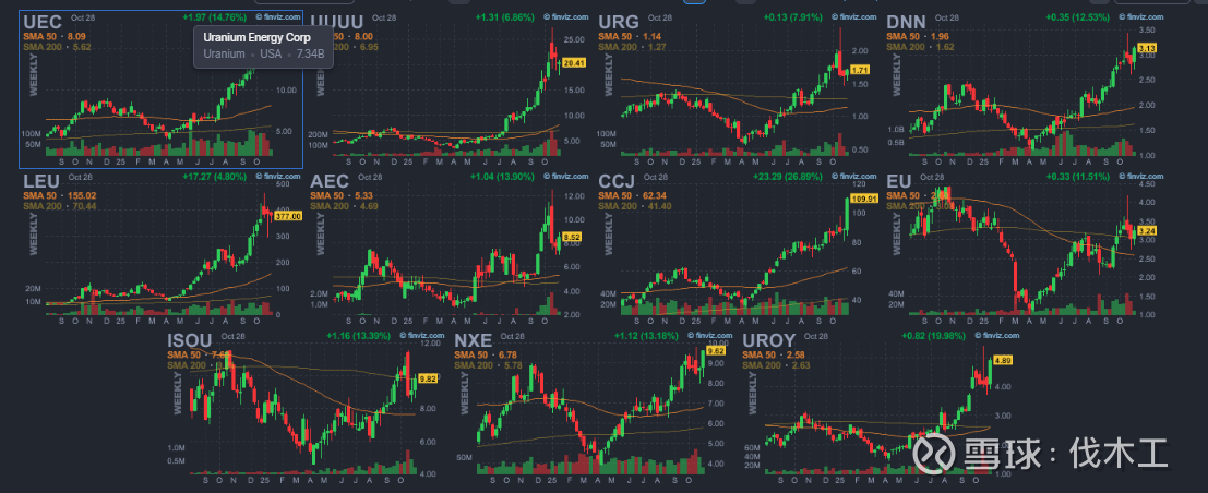 根据2025年10月28日(今日)市场数据,以下铀矿股(UEC、UUUU、URG、DNN、LEU、AEC、CCJ、EU、ISOU、NXE、UROY)整体出现显著上涨,涨幅在5%-23%不等。其中,CCJ(Cameco)领涨超21%,NXE(NexGen Energy)涨约11%,UROY(Uranium Royalty)涨约20%,UUUU(Energy Fuels)涨约6%,URG(Ur-Energy)等其他股票也跟随上涨5%-10%。交易量普遍放大2-5倍,反映出投资者对核能板块的强烈买入热情。这次集体上涨结束了近期盘整,创下短期新高。