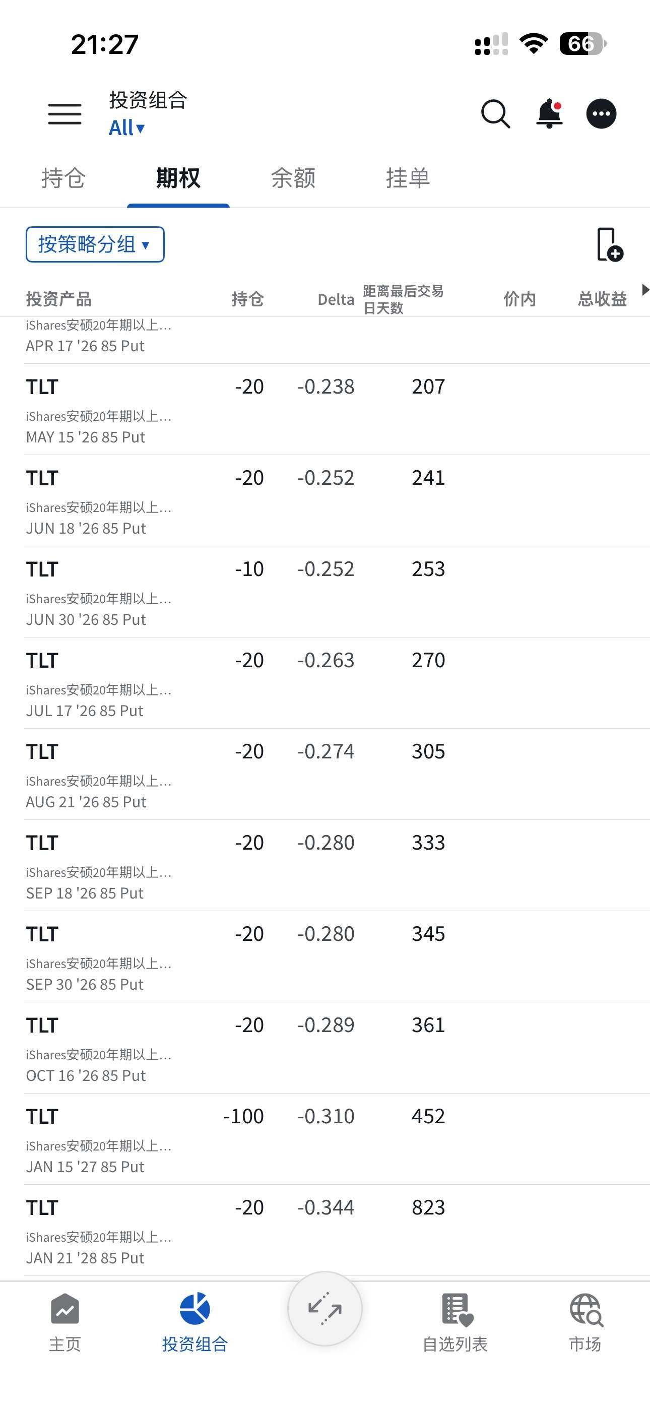 回复@一月五千花不完: 我在做牛市价差 bull put credit spread, 卖84put买85put,每手保证金/押金=100usd,权利金~10usd;或bull call debit spread,卖95call买85call//@一月五千花不完:回复@一月五千花不完:$美国国债20+年ETF-iShares(TLT)$ 一共卖了400多张tlt 的put ,还没过期的大概还有380张,近期卖的权益金少了很多了,总共权益金十六七万刀,目前浮盈50%左右。查看图片