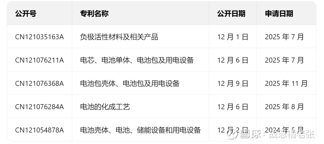 亮点:电池包壳体专利 (CN121076368A) 通过轻量化设计提升重量能量密度;负极活性材料专利 (CN121035163A) 显著改善电池快充性能。
