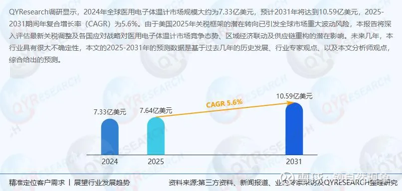 这市场到底有多大?据报告大厅及观研报告网综合数据显示,2024年中国智能体温计市场规模已达19.5亿元(约2.79亿美元),预计2025年整体电子体温计市场将达25亿元左右,到2030年有望增长至55亿元,年复合增长率保持在12%左右。全球市场同样潜力可观,2024年电子体温计整体市场规模约10亿美元,预计2031年将突破14亿美元,中国企业正在积极抢占这个大蛋糕。