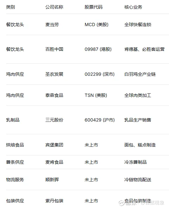 市场上还对以下巨头时刻关注的:① 餐饮龙头:麦当劳(美股MCD)、百胜中国(港股09987)。② 供应链企业:圣农发展(002299)、泰森食品(美股TSN),以及为麦当劳提供乳制品的三元股份。