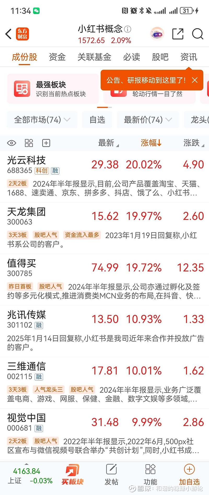 AI今日分化,小红书概念走强!1群总的三维通信(客户运营服务中标小红书等行业头部企业),目前封单近40亿、大热的蓝色光标(小红书广告代理),$佳云科技(SZ300242)$ (互联网媒体广告客户包括小红书)大概率补涨!